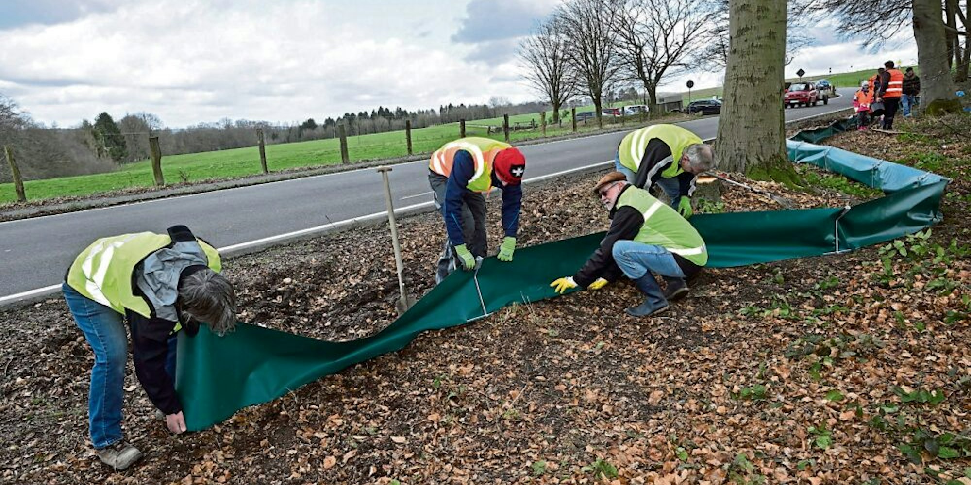 Um die Tiere vor dem Unfalltod zu schützen, hat der Bergische Naturschutzverein nun wieder ein Amphibienschutzzaun aufgebaut. Dieses Jahr wurde die Sperre um 200 Meter verlängert und umfasst jetzt nicht nur das Waldstück gegenüber vom Wanderparkplatz, sondern ragt bis auf die angrenzende Wiese hinaus. Entlang des Zaunes wurden Eimer in den Boden gelassen, in denen sich die Amphibien sammeln, um dann – bis April – jeweils morgens und abends von 18 freiwilligen Helfern des Bergischen Naturschutzvereins, der Krötenzählergrube und des Kreisfischereivereins behutsam über die Straße getragen zu werden.