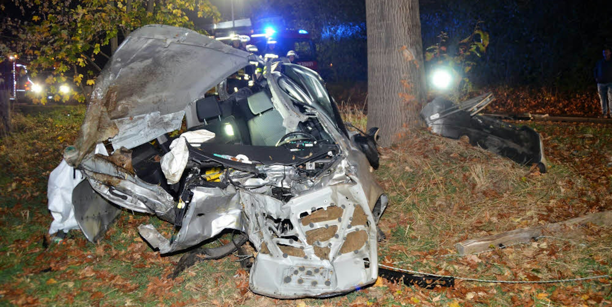 Den Unfallhergang schildert die Polizei wie folgt: Das Unfallfahrzeug fuhr auf der B 506 aus Kürten-Bechen kommend in Richtung Bergisch Gladbach. Am Ortseingang sei der Pkw aus noch ungeklärter Ursache gegen den rechten Bordstein geraten und auf die Gegenfahrspur geschleudert worden. Dort sei der Wagen mit zwei Bäumen kollidiert. Durch die Wucht des Aufpralls wurde die Vorderachse des Autos abgerissen.