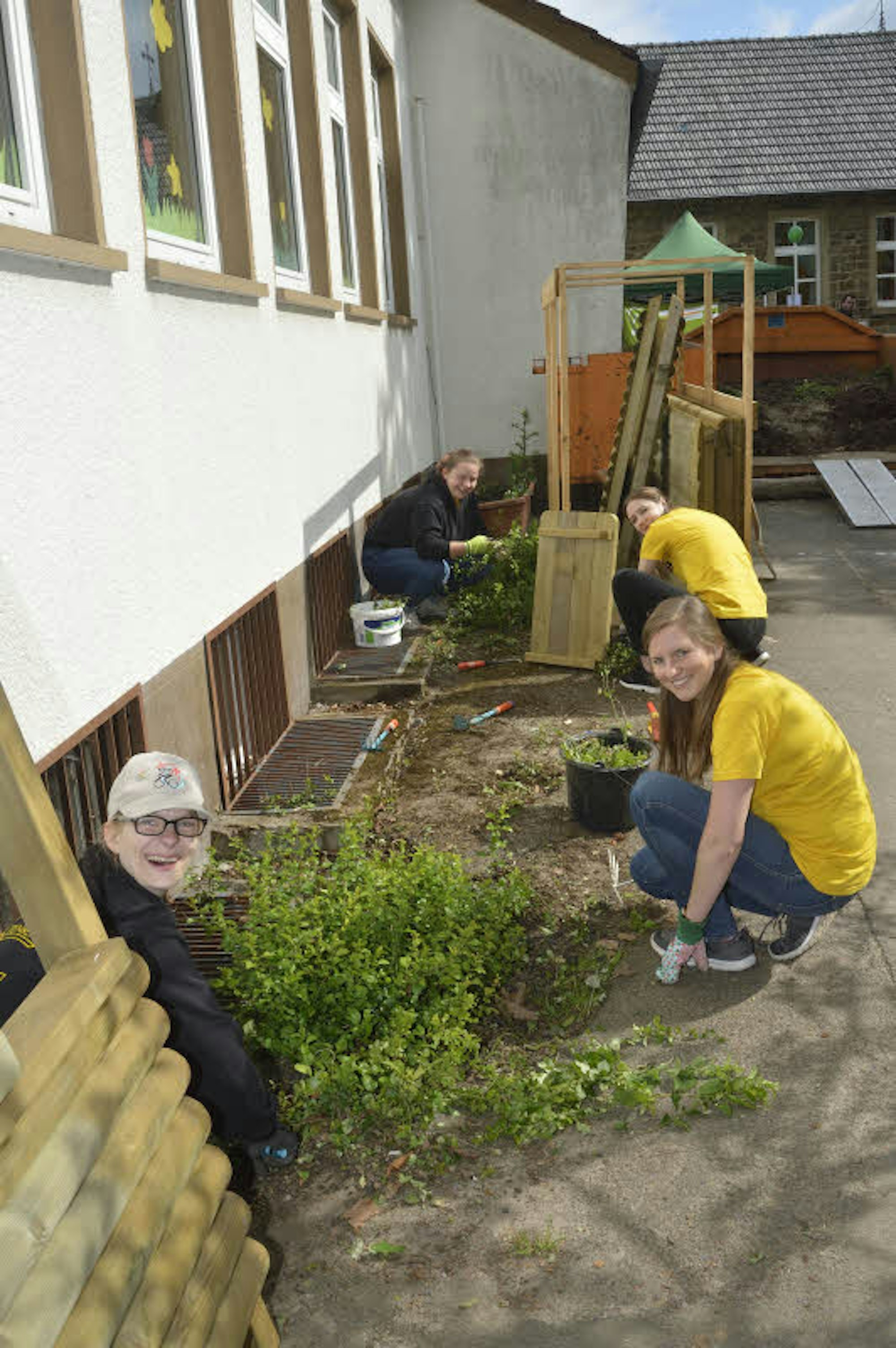 Das Außengelände des katholischen Kindergartens in Hüttchen brachten Aktive der Katholischen Landjugendbewegung (KLJB) mit ihrem Arbeitseinsatz auf Vordermann. Neben Unkraut-Jäten und Pflanzarbeiten war auch eine Holzhütte für die Kinder zu bauen.