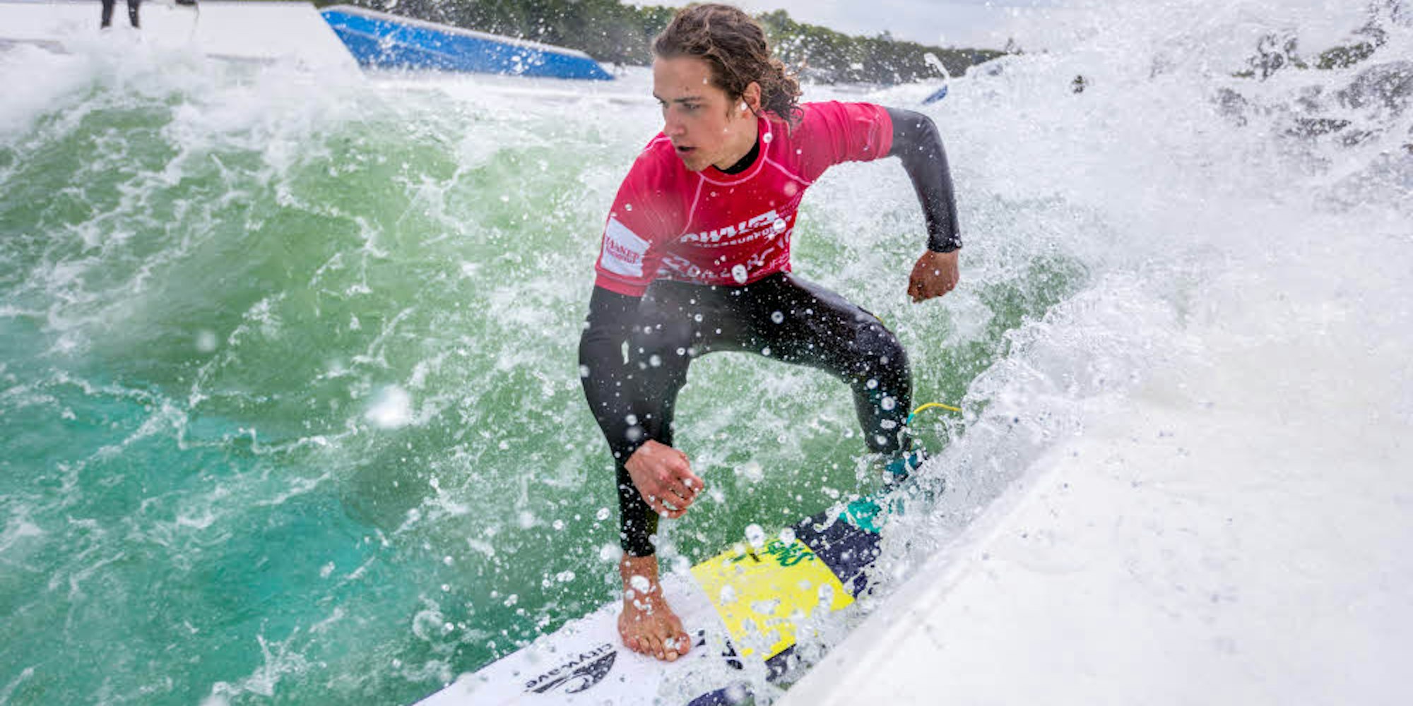Surfer Lenny Weinhold bei der ersten Deutschen Meisterschaft in der Freiluft-Anlage „Surf Langenfeld“. Können Surfer bald auch in Voiswinkel trainieren?