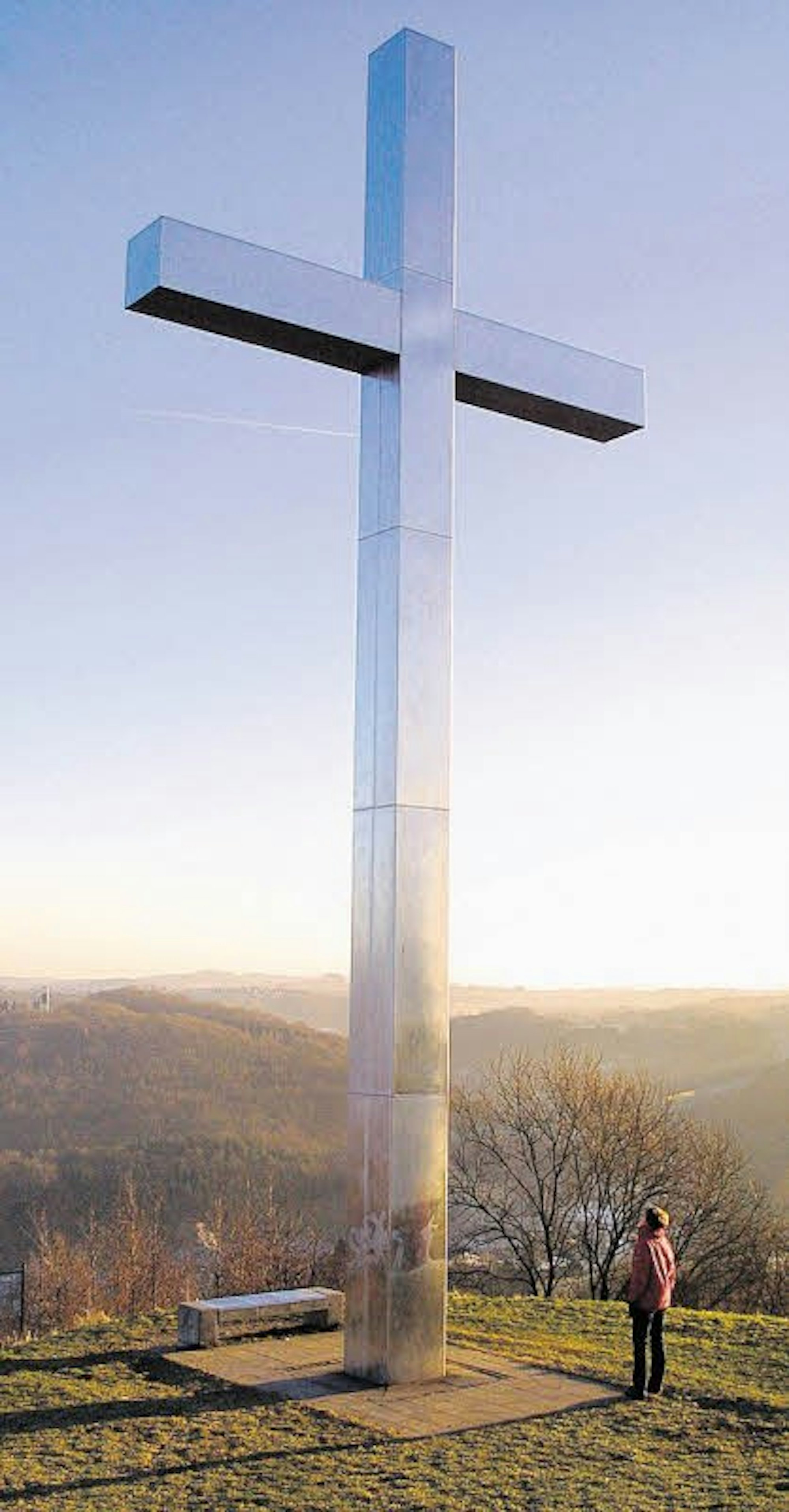15 Meter hoch ist das Barbarakreuz auf dem Lüderich zwischen Overath-Steinenbrück und Rösrath-Hoffnungsthal. Von der St.-Barbara-Kirche in Steinenbrück erreicht man es über einen Fußweg.