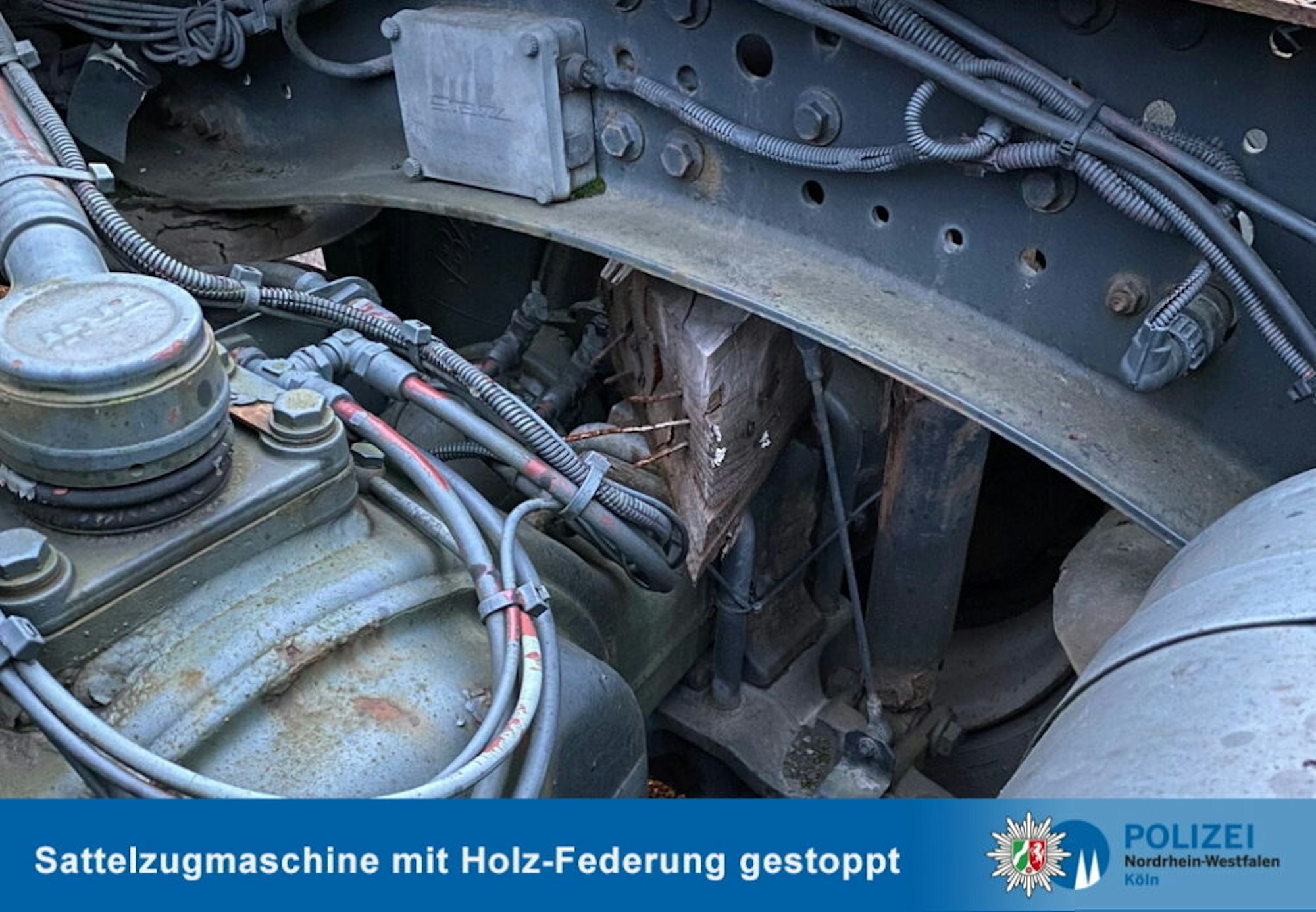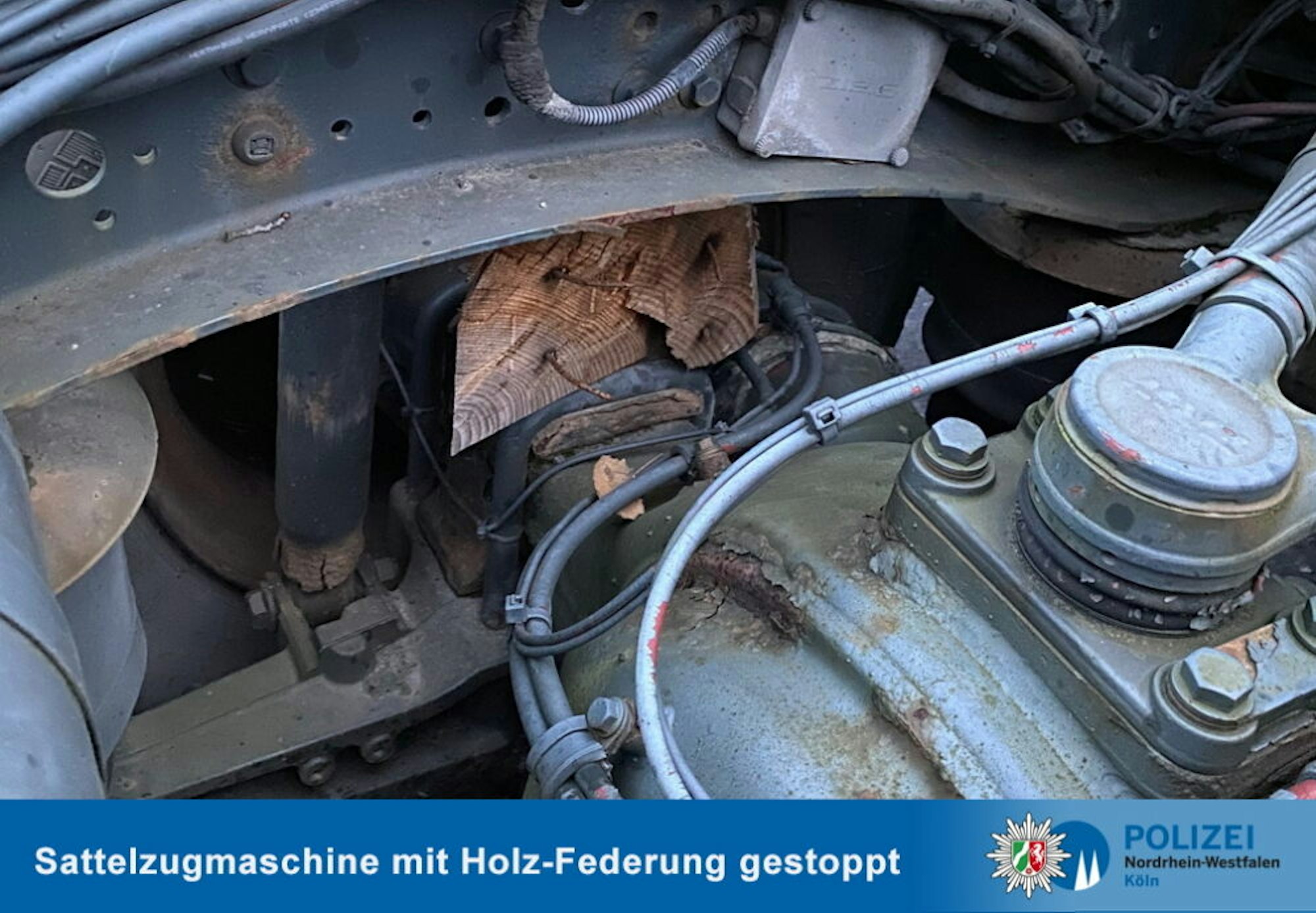 Overath – Da staunten nicht nur die Mitarbeiter des Bundesamtes für den Güterverkehr (BAG), sondern auch die hinzugezogenen Beamten der Autobahnpolizei: Dort, wo bei einem Lkw normalerweise die Federung an der Antriebsachse für Fahrsicherheit eines Sattelzugs sorgt, steckten bei dem unweit von Overath gestoppten Gefährt lediglich Holzklötze. Offenbar „um den auch sonst vor Mängeln strotzenden Fahrzeugrahmen notdürftig in der Waage zu halten“, wie ein Sprecher der Autobahnpolizei vermutete.