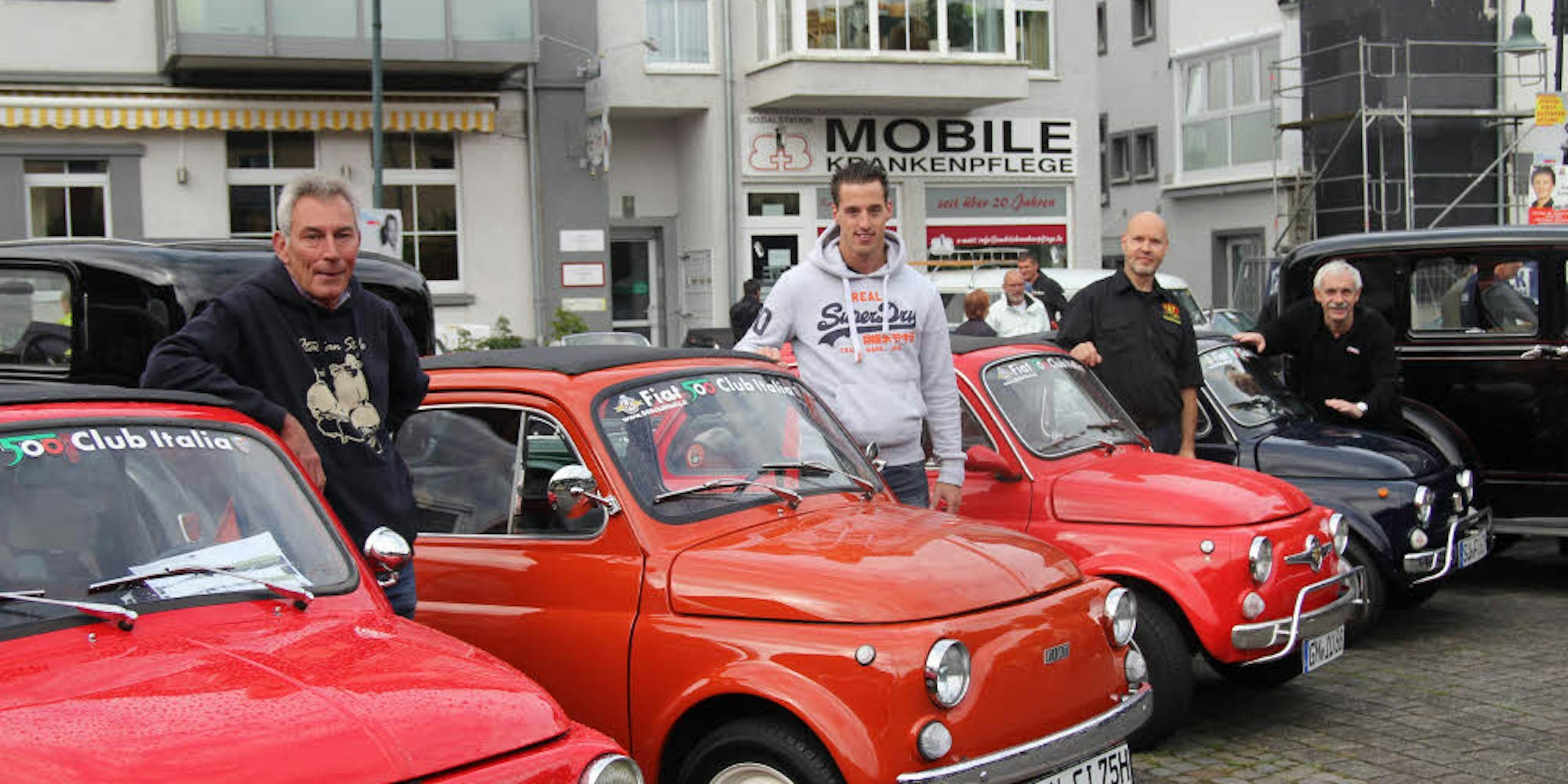„Ein Wrack“, sagt er, aber das meint er positiv – er freut er sich auf die viele Arbeit. Nach Overath hatte Schollee seine Fiat 500-Freunde eingeladen. Die waren mit ihren italienischen Kleinwagen-Klassikern aus Bad Neuenahr, Siegburg und Wipperfürth zum Bahnhofsplatz gekommen.