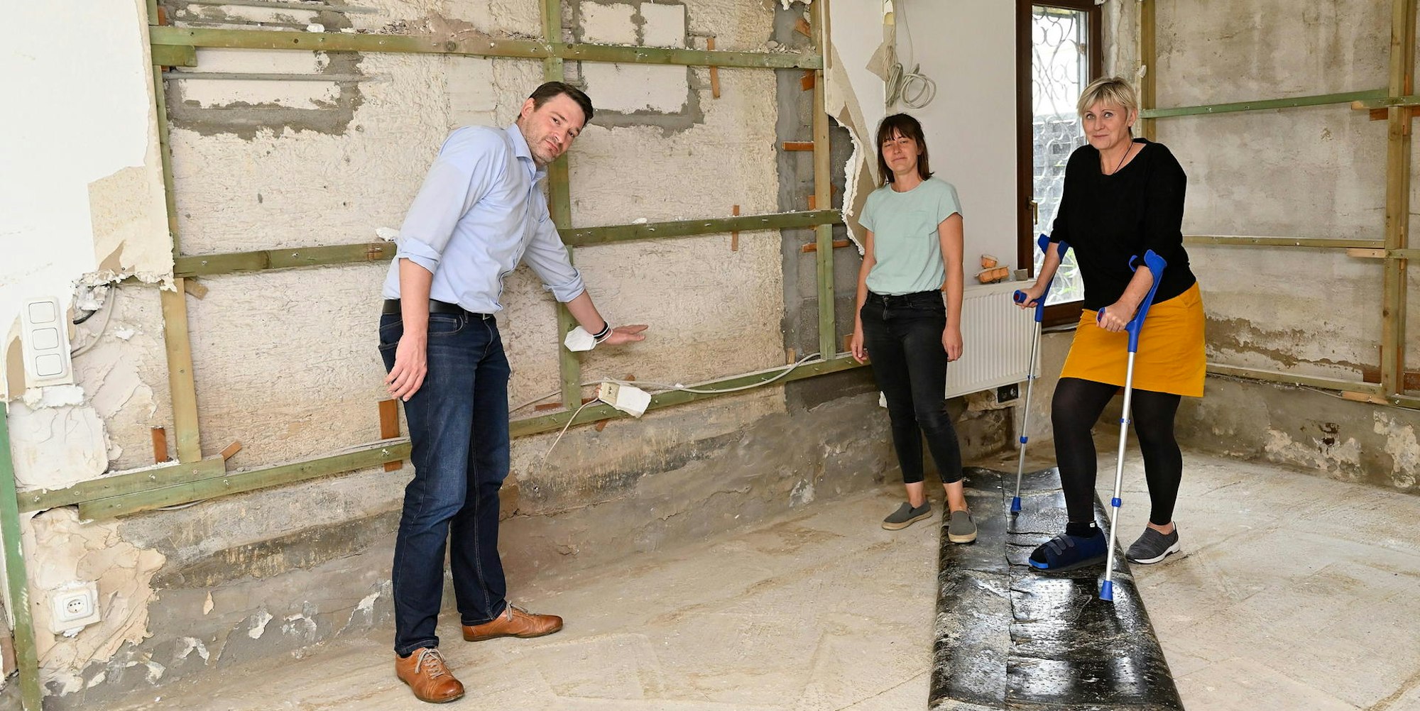 80 Zentimeter hoch stand das Wasser in einem Wohnraum im Erdgeschoss. Uwe Pakendorf beim Ortstermin in Unterauel. Karola Schönhofer (M.) und Kirsten Schou-Harms von der Bürgerinitiative Sülzauen sind selbst betroffen.