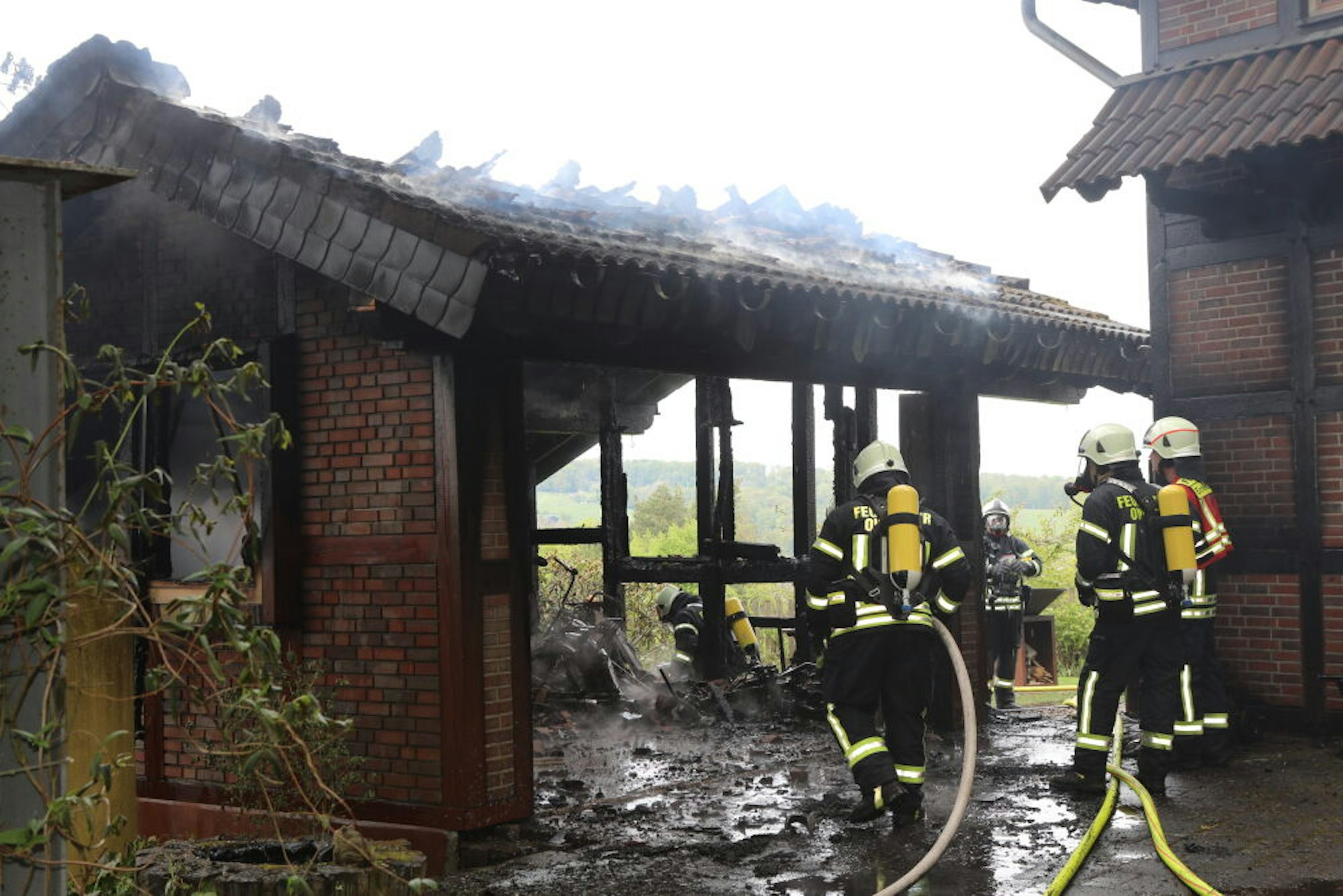 Overath – Schon auf der Anfahrt von Heiligenhaus und Immekeppel sei die schwarze Rauchsäule über dem Höhenrücken zwischen Sülz- und Holzbachtal zu sehen gewesen, sagt Feuerwehrsprecher Marco Bücheler. Als die ersten Einsatzkräfte in Busch ankamen, brannte dort eine Garage in voller Ausdehnung. Die ersten Fenster des angrenzenden Hauses waren bereits geborsten.