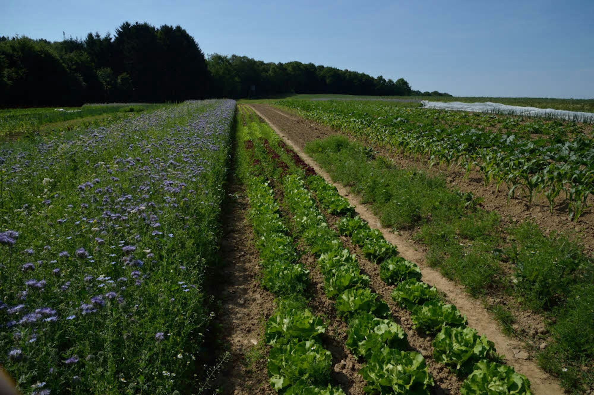 Der knappe Hektar ist schnell belegt mit Gemüsen der Saison. Ein Kiefernwald schützt die Pflanzen.