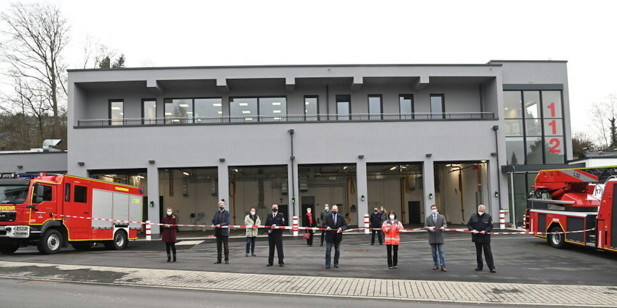 Zwischen zwei Feuerwehrfahrzeugen war das rot-weiße Flatterband gespannt, das von den offiziellen Gästen feierlich durchschnitten wurde.