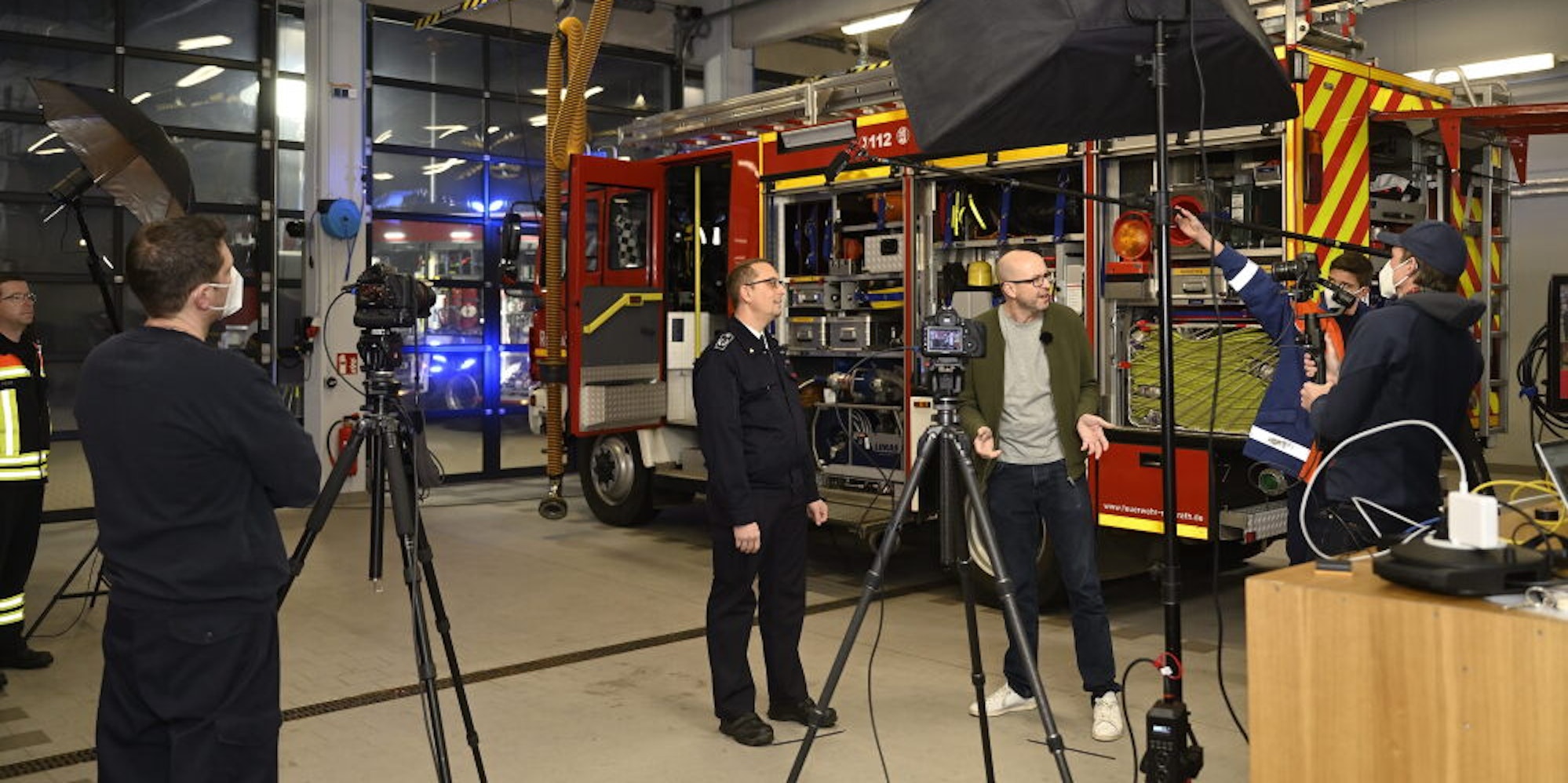 Das Feuerwehrhaus als Studio: Fernsehreporter Matthias Fiedler lässt sich Fahrzeuge und Material der Feuerwehr erklären. (Archivfoto)