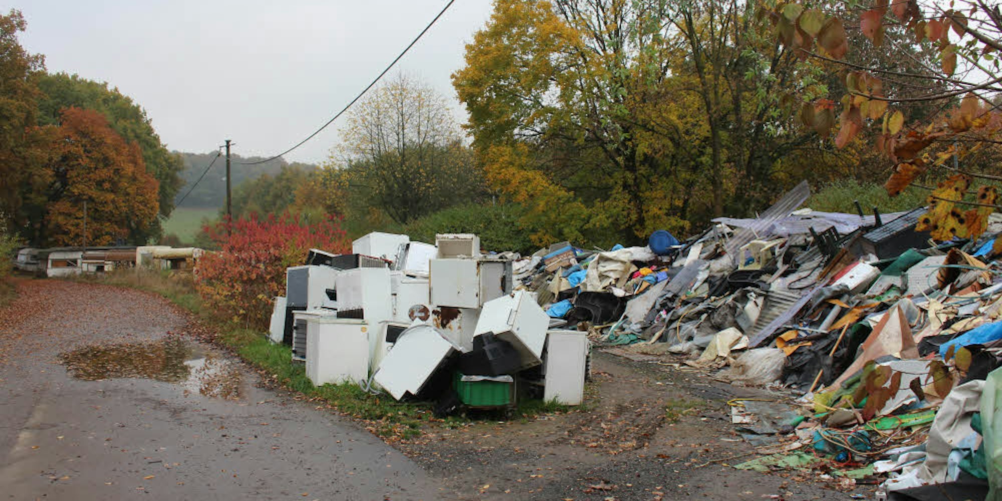 Ausgeschlachtete Campingwagen, alte Kühlschränke und anderer Müll warten derzeit auf der Stadtgrenze von Overath und Lohmar auf ihre umweltgerechte Entsorgung.