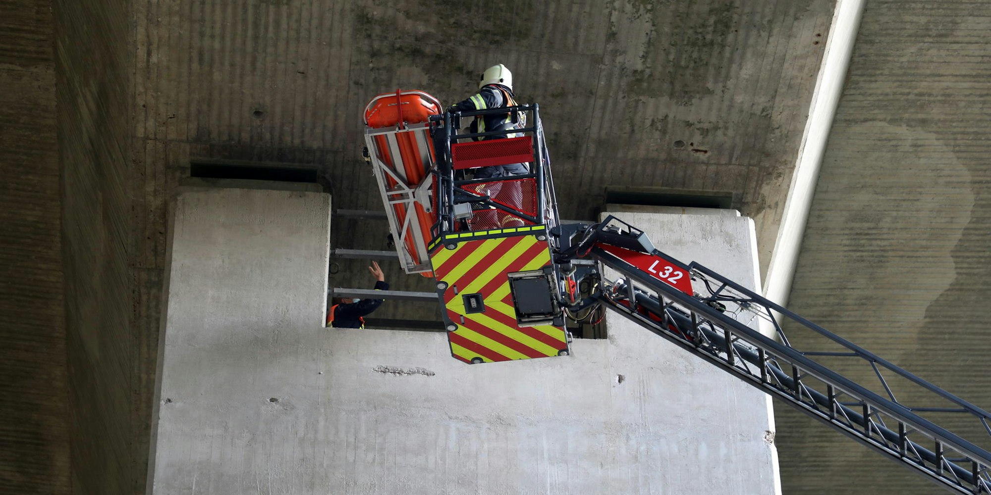 In luftiger Höhe: Per Trage an der Drehleiter wird ein „Verletzter“ von einem Brückenpfeiler gerettet.