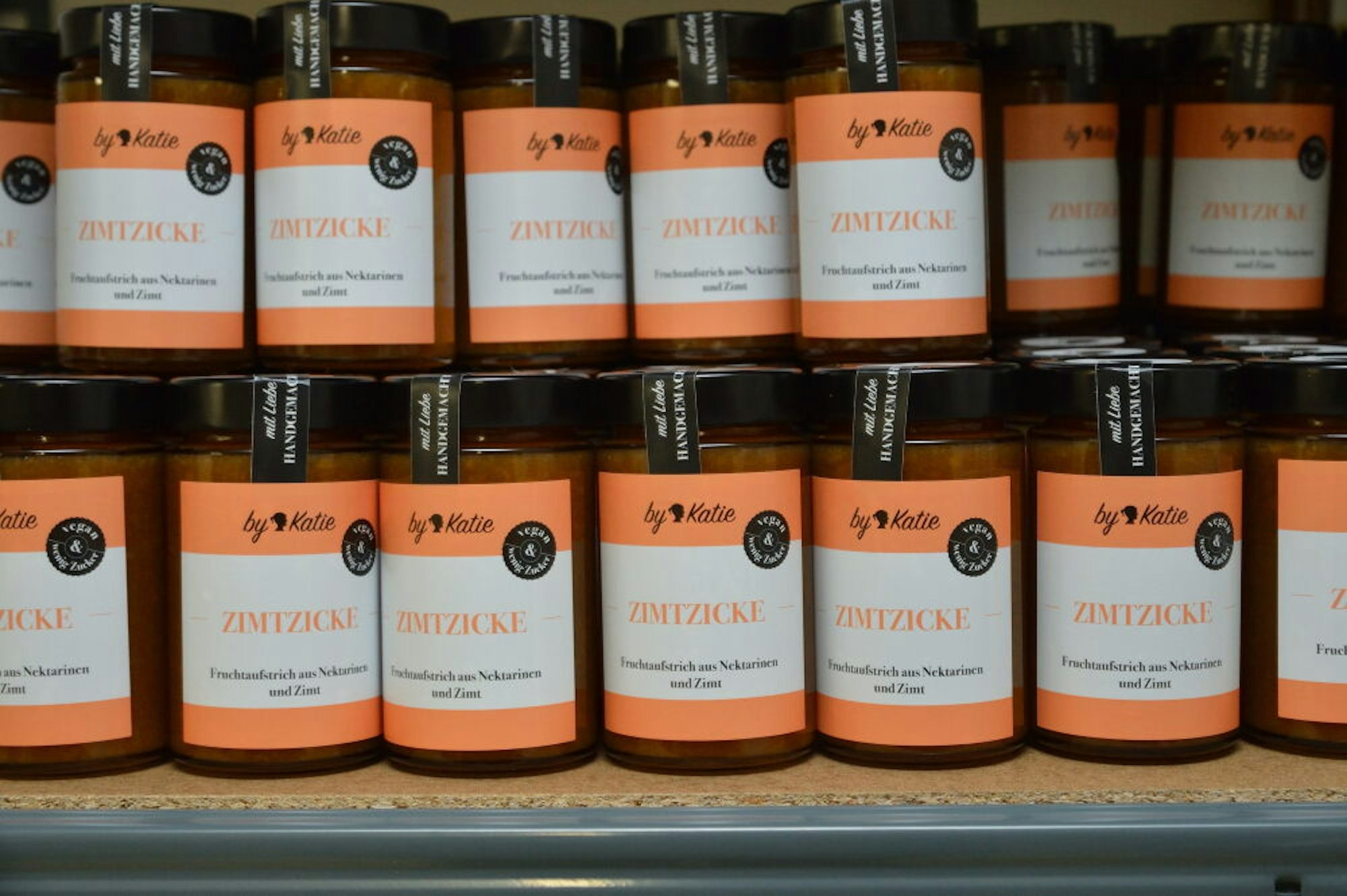 70 Kilogramm Früchte verarbeitet Katja Henn nahezu täglich zu Marmelade. „Bis zum frühen Nachmittag bin ich mit der Produktion durch und habe dann Zeit für meine Familie.“ Das Obst bekommt sie vom Großmarkt über einen Händler oder auch mal vom Nachbarn, der große Mengen Äpfel zur Verfügung stellt. „by Katie“-Produkte sind vegan. „Außer die Sorten mit Schokolade. Ich gebe nur normalen Zucker zu, keinen Gelierzucker, sowie Pektin und Zitronensäure.“ Je nach Jahreszeit friert sie Früchte ein. Manchmal gehen auch ihr die Obstvorräte aus. „Als ich längere Zeit keine Nektarinen bekam, war die Sorte Zimtzicke schnell ausverkauft.“