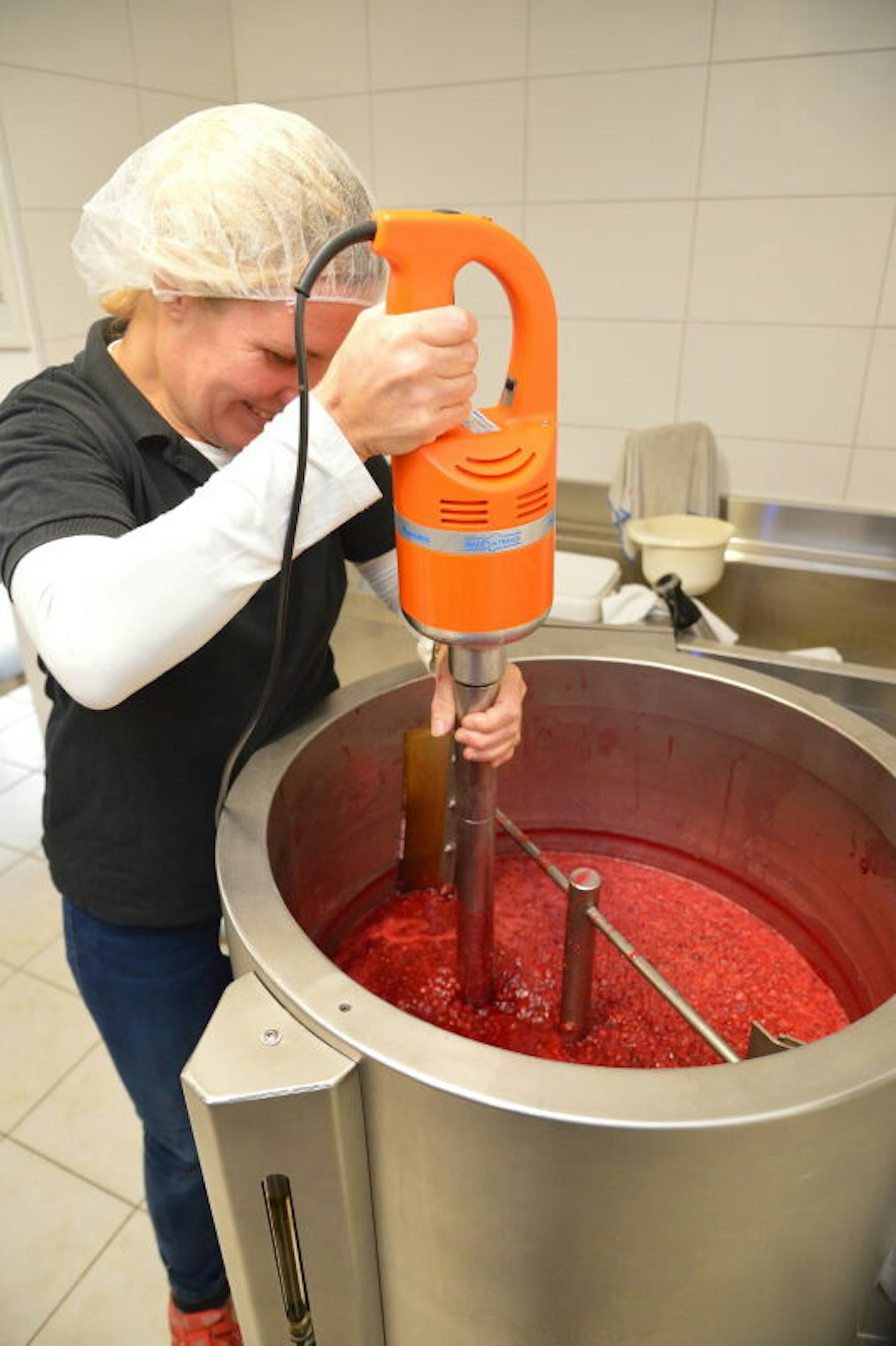 Overath – Glänzend rote Johannisbeeren erhitzen langsam in einem runden Ofen. Allmählich verlieren 45 Kilogramm Früchte ihre beerig-runde Form. „95 Grad heiß muss die Masse werden, ehe sie abgefüllt werden kann“, sagt Katja Henn während sie Apfelpektin auf die Beeren streut. Dann verrührt sie alles per Hand mit einem großen Gastro-Pürierstab. Auch reichlich Bourbon-Vanille darf nicht fehlen. Erst dann ist „Blutsbrüder“, eine von rund 30 Marmeladensorten perfekt, und nach einer Stunde zum Abfüllen bereit.