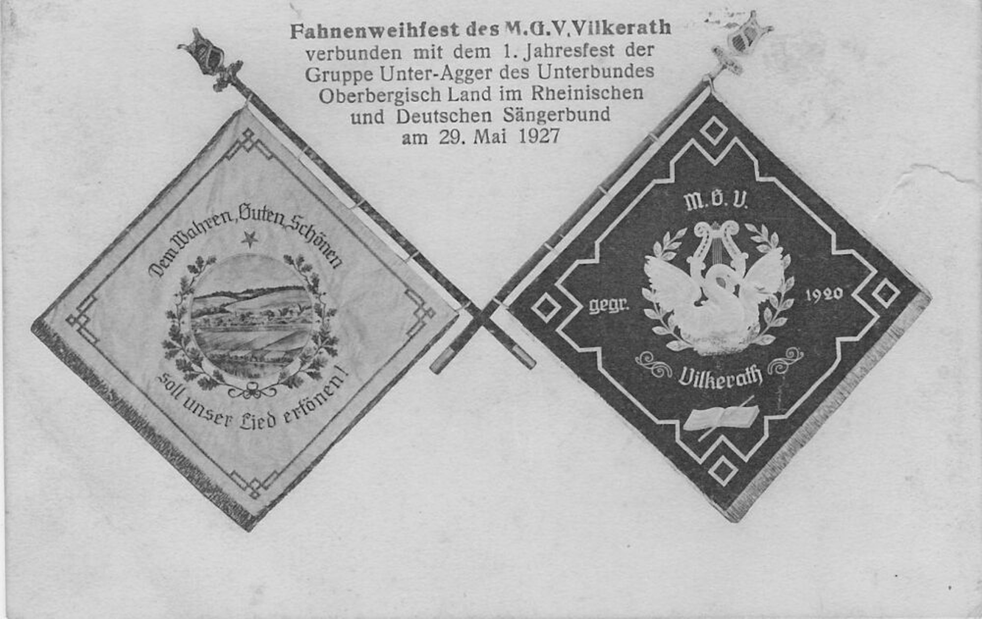 Die Vereinsfahne des MGV Vilkerath mit Motto beim Fahnenweihfest im Jahre 1927.