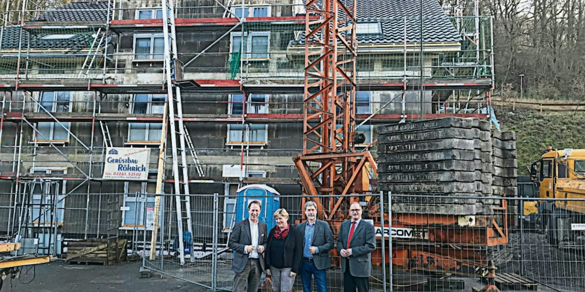 Vor dem Neubau für das Betreute Wohnen in Overath: (v.l.) Geschäftsführer Thomas Hambüchen, Claudia Middendorf und die Vorstandsmitglieder Hans-Hermann Tirre und Christian Möbius.