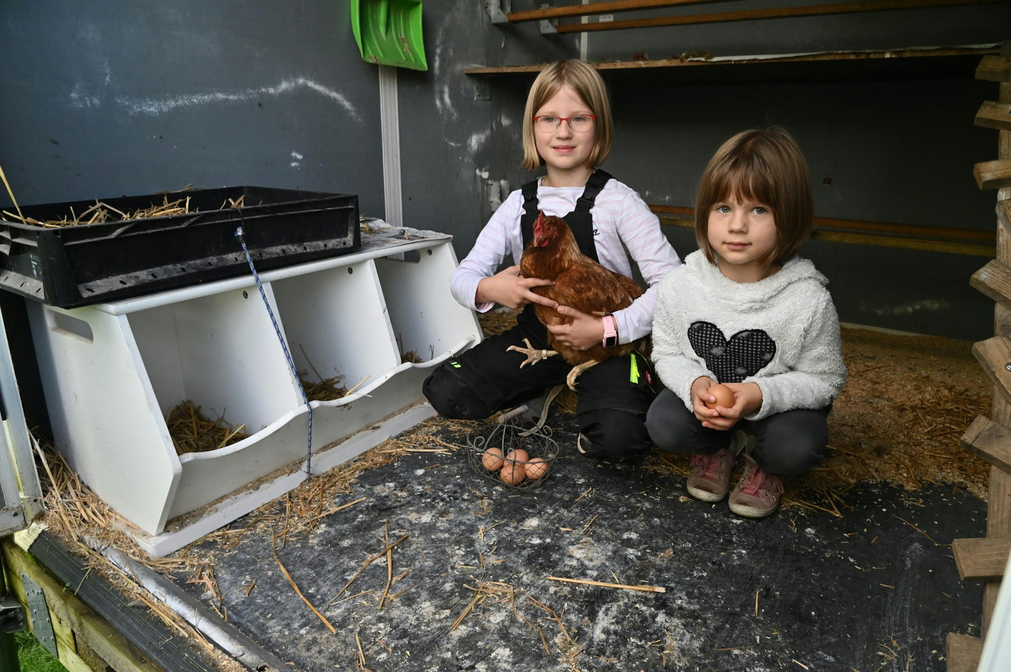 Die Töchter Emma (l.) und Paula sammeln im Stall die Eier ein.