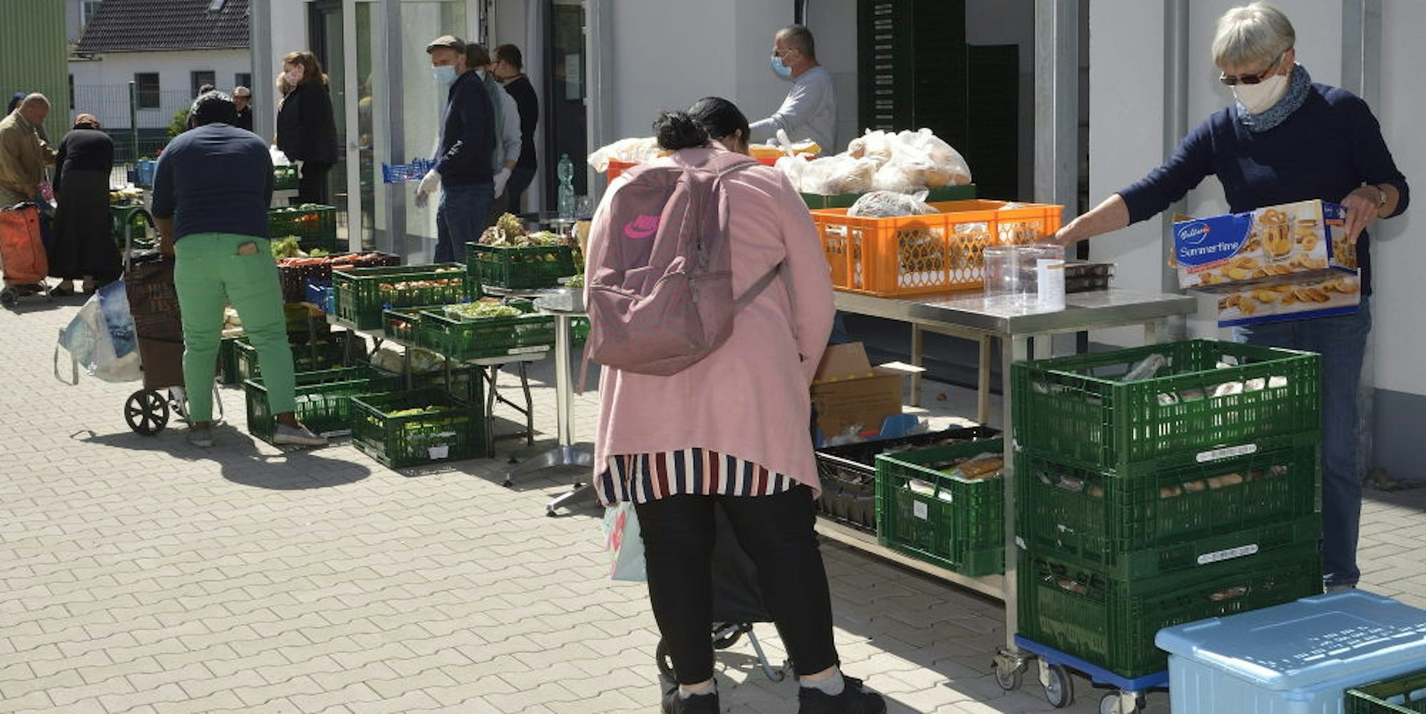 Ergebnis: Erstmals am Mittwoch bekommen die ergrauten Tafel-Helfer selbst Hilfe. Zum Sortieren der Lebensmittel rückt am Mittwoch eine sechsköpfige Gruppe von Messdienern im jugendlichen Alter aus Steinenbrück an, und bei der Warenausgabe am Nachmittag, die wegen des guten Wetters im Freien stattfindet, packen Helfer von der Nachbarschaftshilfe an: Lehrer, Studenten, auf Kurzarbeit gesetzte Arbeitnehmer. Genauso selbstlos wie sonst die aus der Generation Silberlocke.