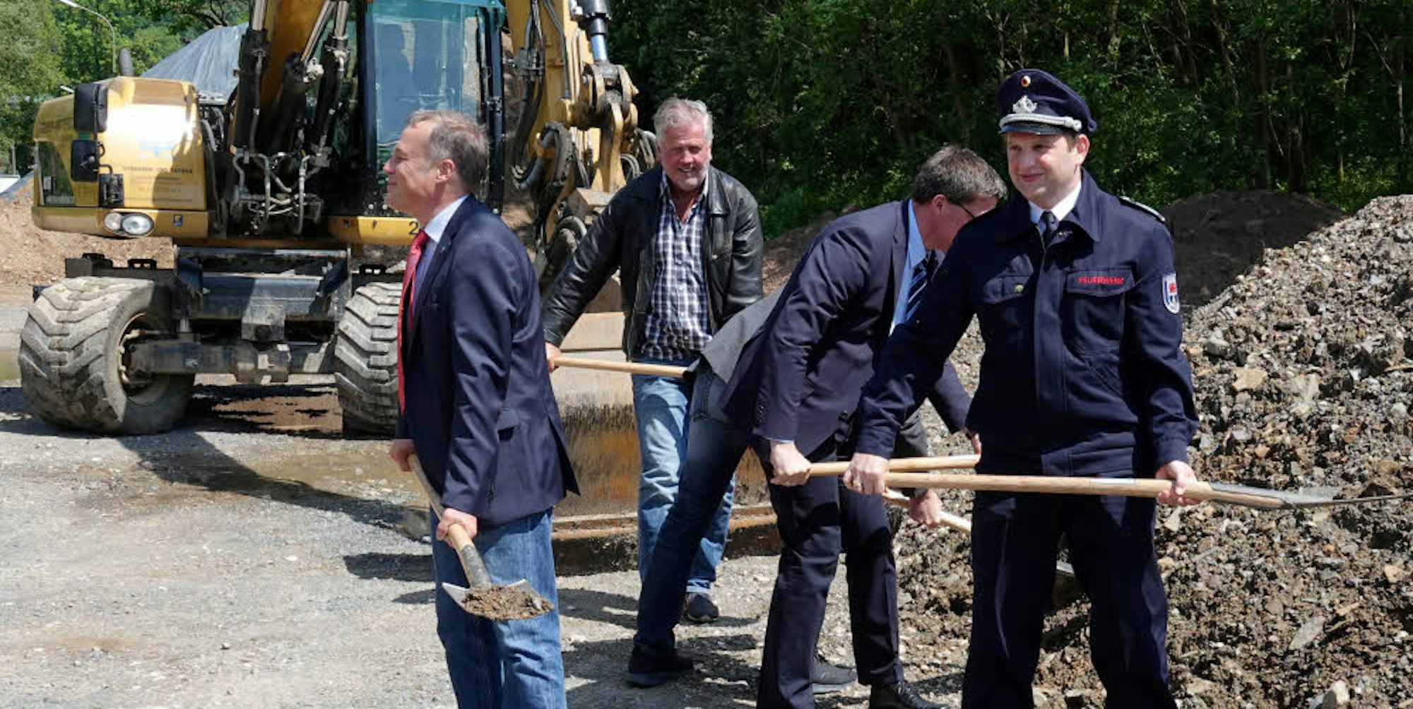 Letzte Vorbereitung für den ersten Spatenstich: (v.l.) Bürgermeister Jörg Weigt, Sego-Geschäftsführer Wolfgang Bürger, Landrat Stephan Santelmann und der Overather Feuerwehr-Chef Heiko Schmitt.