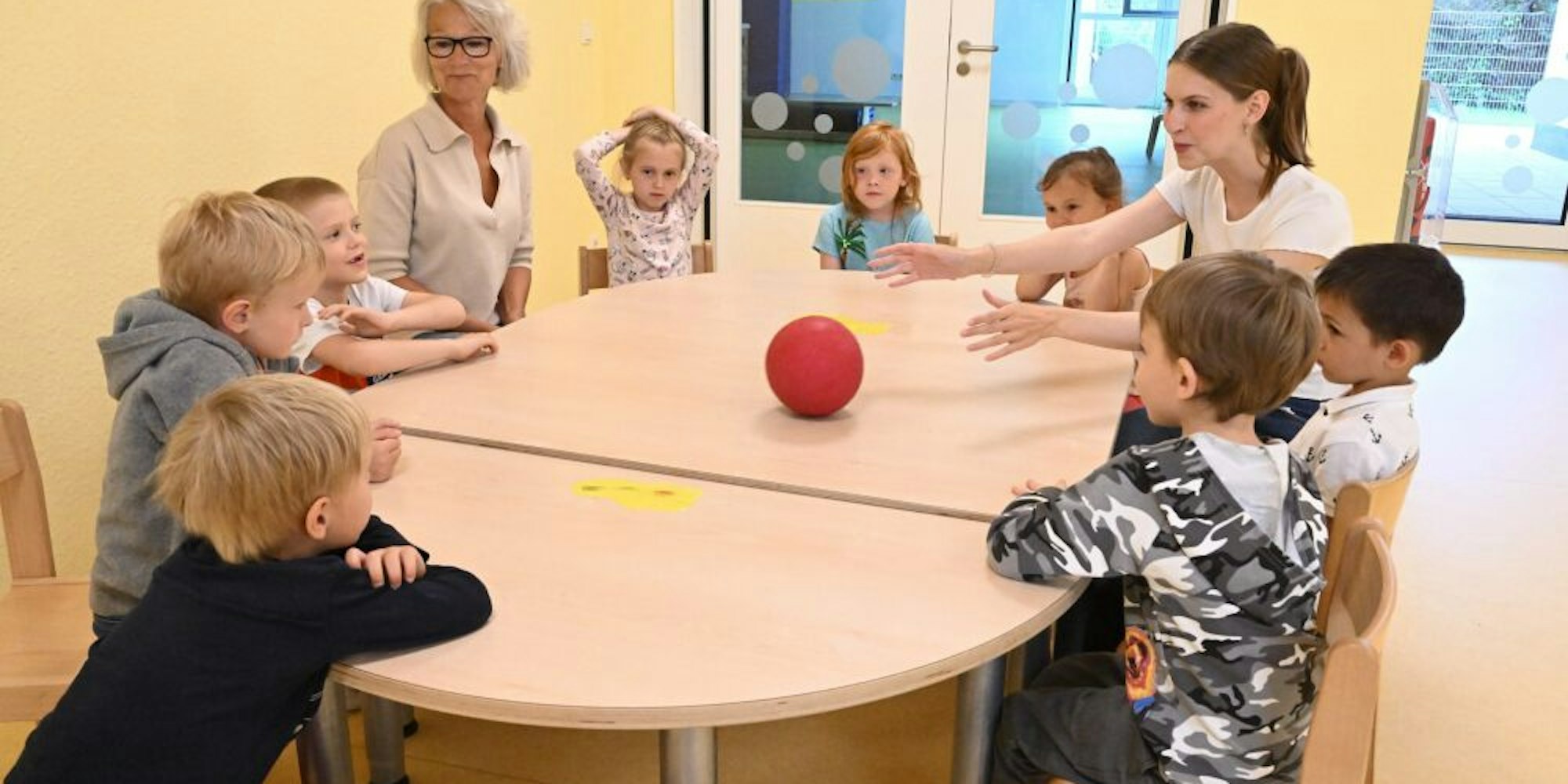 Overath – Der kleine rote Ball rollt über den Tisch, von einem Kind zum anderen. „Ich heiße Julya“ sagt das kleine Mädchen mit den roten Haaren und schießt den Ball über den Tisch zu einem Jungen, der brav ebenfalls den Satz sagt: „Ich heiße Maxsim.“ Besonders häufig wandert der Ball zu den beiden Betreuerinnen der zehnköpfigen Kindergruppe, Sylvia Knewel und Melissa Befus.