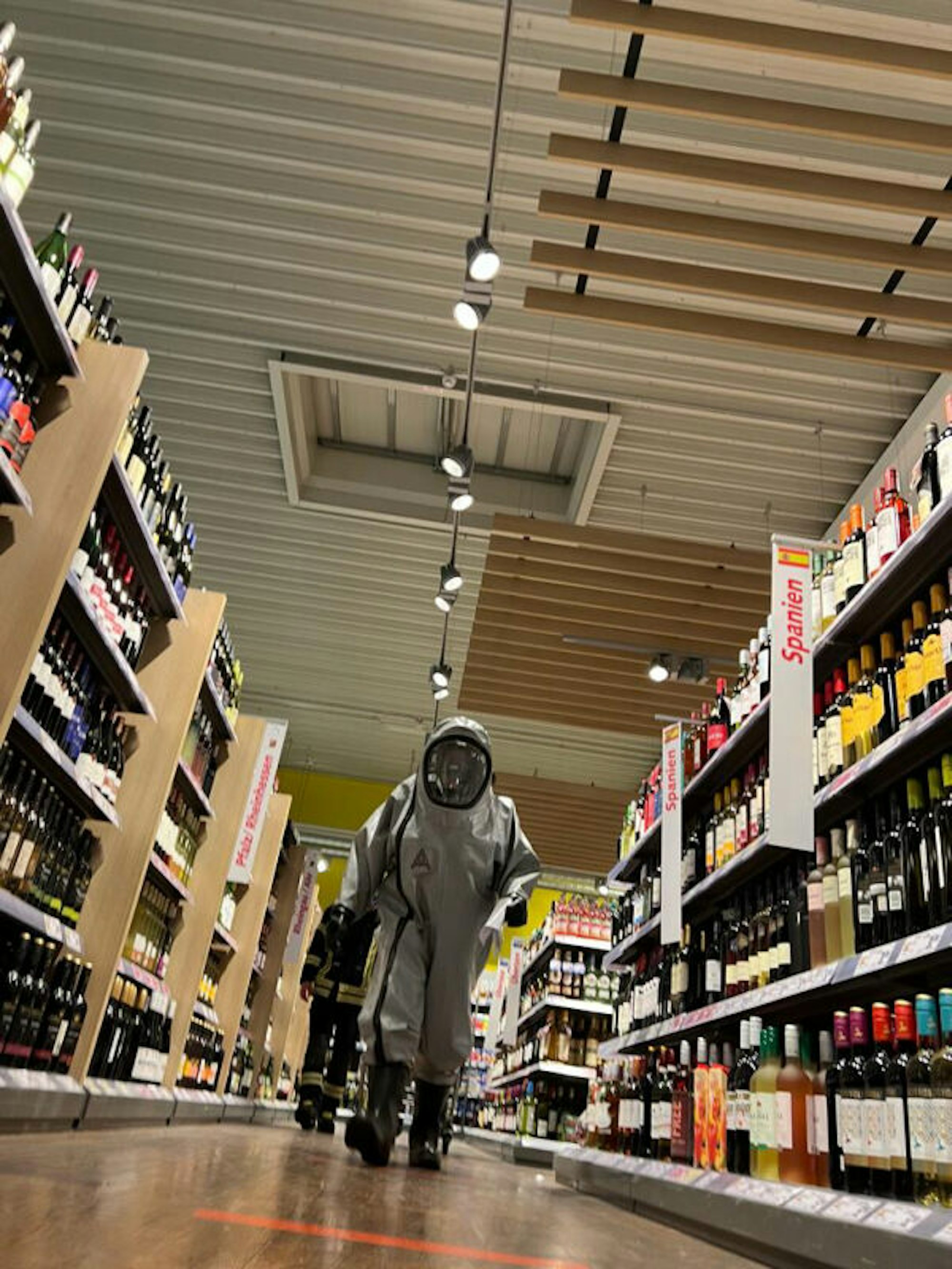Und tatsächlich steckten Feuerwehrleute in den Chemikalienschutzanzügen. Allerdings meisterten sie darin keinen brisanten Gefahrguteinsatz oder schützten sich gar vor Viren, wie mancher Zeitgenosse schon annahm, sondern gingen scheinbar beiläufig einkaufen.
