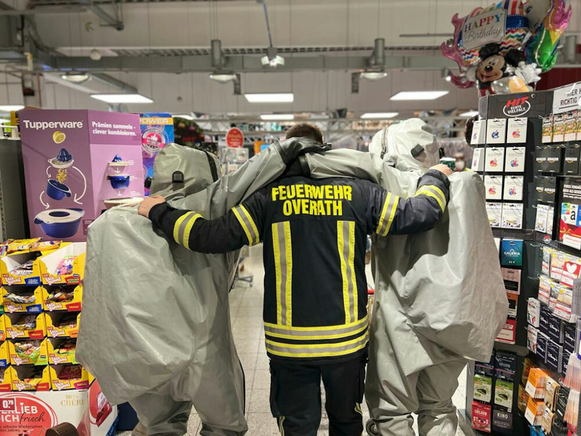 Overath – Da staunten einige Passanten nicht schlecht, als sie am Freitagabend im Overather Hit-Markt einkauften: In den Gängen zwischen Regalen und Kühltheken standen sie plötzlich vor Menschen in eigenartigen Schutzanzügen wie man sie sonst nur auf Bildern von Großeinsätzen der Feuerwehr sieht.