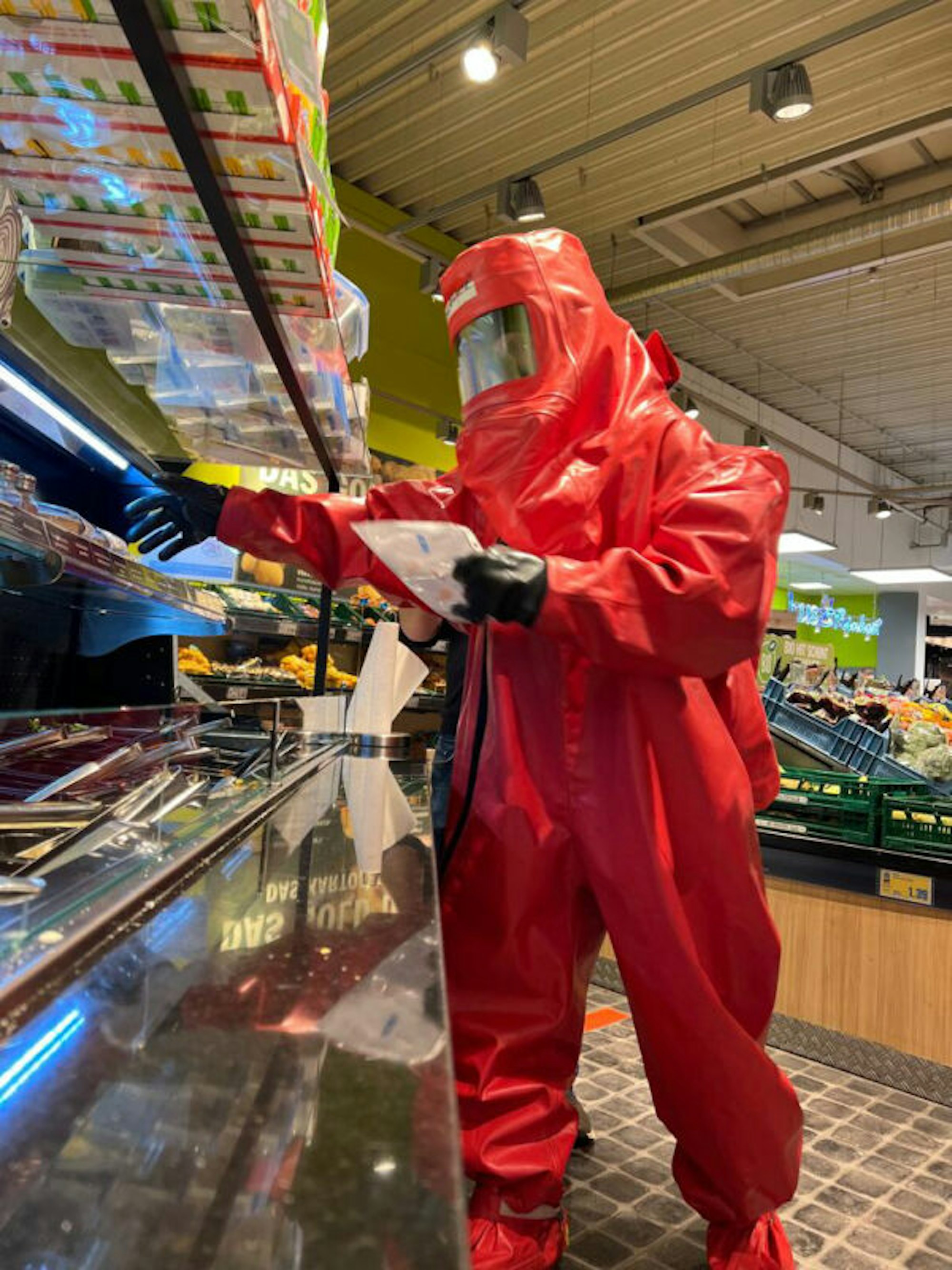 Das Einkaufen im Chemikalienschutzanzug, kurz CSA, sorgte nicht nur für viel Aufmerksamkeit. „Es galt gleichzeitig als Übung für unsere Kameraden, um etwas Feinmotorik zu erlangen“, so ein Sprecher der Feuerwehr.