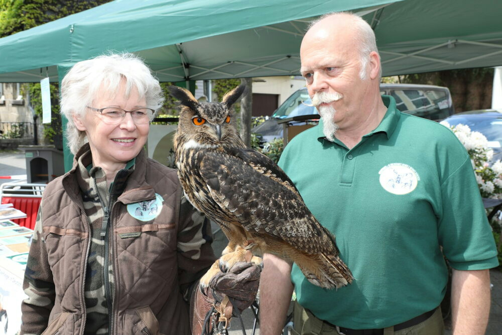 Uhu „Henry“, hier mit Gbie Fiebig und Ingo Weber vom Verein für Greifvogel- und Wildschutz in Wermelskirchen, war einer der Stars an den Ständen des Overather Frühlings.