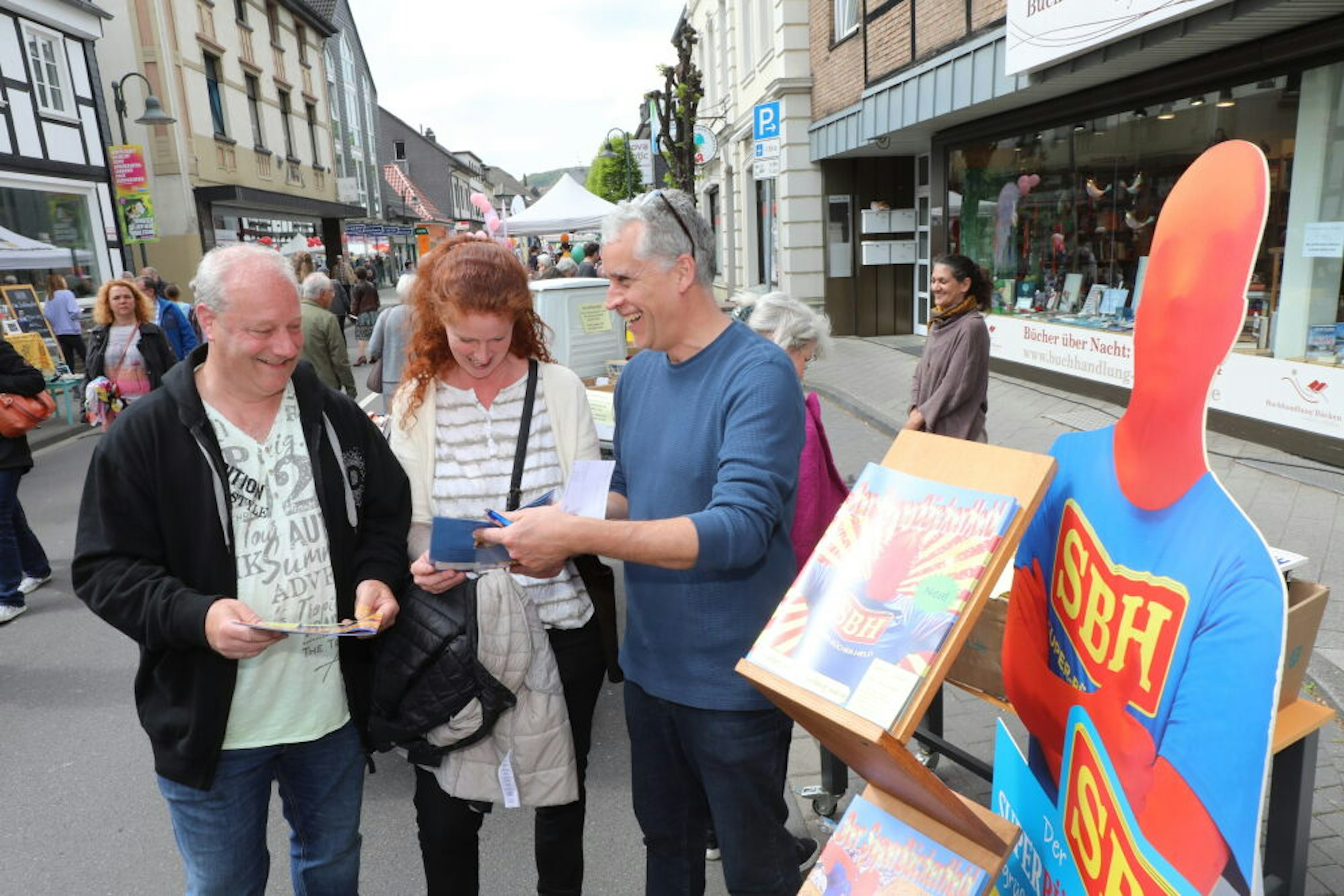 Buchhändler und Super-Bücher-Held Alexander Bücken (r.) vor seiner Buchhandlung beim Overather Frühling.