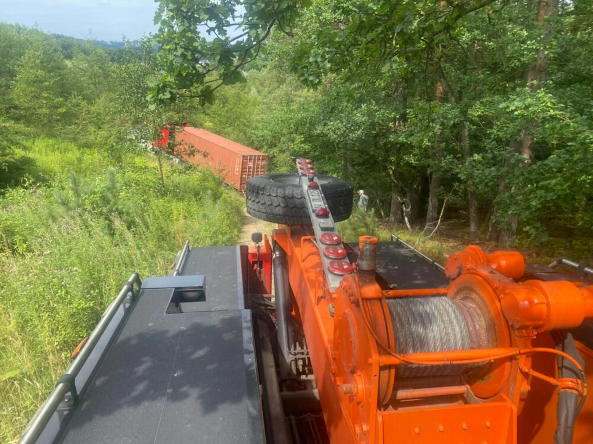 Blick aus dem Leitstand des MAN-Spezialbergungsfahrzeugs auf eine der Seilwinden, mit denen der 40-Tonner-Container-Lkw (im Hintergrund) rückwärts den steilen Weg wieder hinaufgezogen wurde, den er vor knapp zwei Wochen auf einer Irrfahrt hinuntergefahren war.