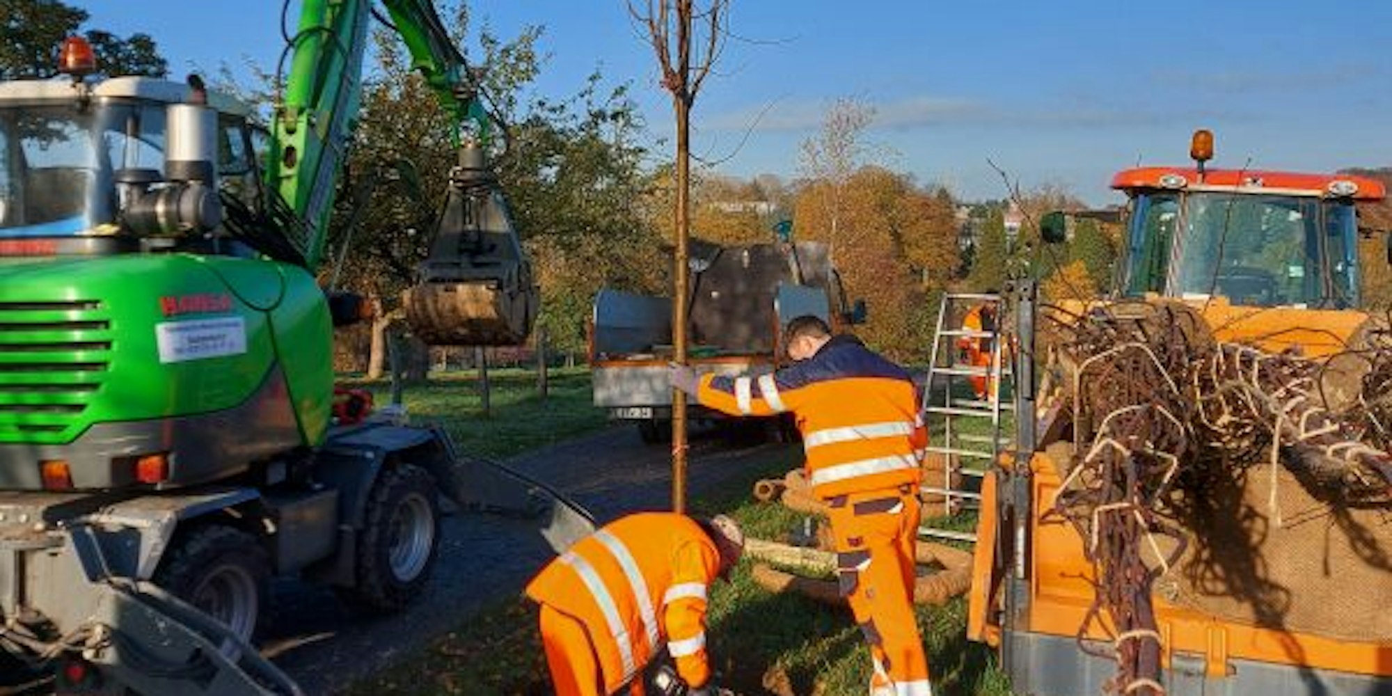 Die erfolgreiche Pflanzkampagne der Stadt macht Burscheid grüner und klimafreundlicher: Mitarbeiter des Baubetriebshofs beim Pflanzen von Winterlinden im Bereich Löh.