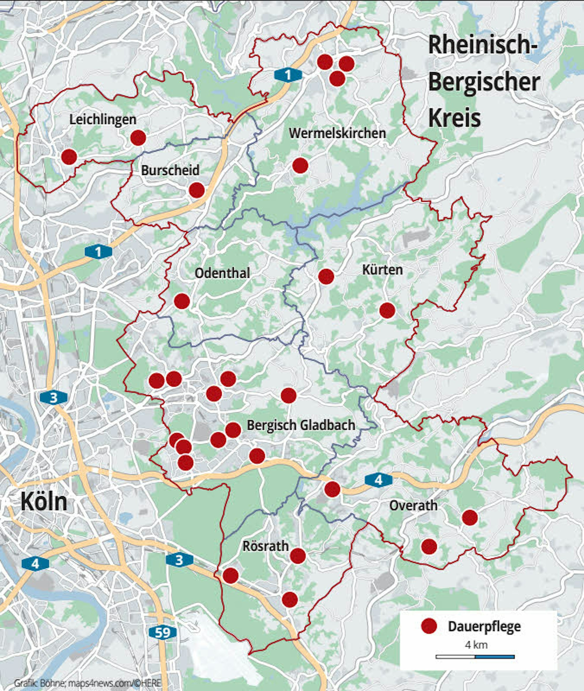 So müssen bis 2022 in Bergisch Gladbach 144 zusätzlicher Heimplätze entstehen und 165 Plätze bei Pflegediensten. Rösrath braucht 41 beziehungsweise 49 weitere Plätze, Overath 34/44 Plätze, Kürten 26/33, Odenthal 31/30, Burscheid 24/29, Leichlingen 34/40 und Wermelskirchen 47/52 Plätze.