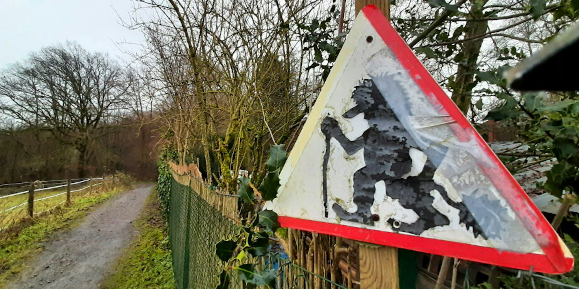 Wir erreichen den Weiler Bömerich, gehen auf der Straße nach dem Fußgängerdurchlass geradeaus durch den Ort und dahinter durch eine Rechtskurve an einer Weide entlang. Nachdem die Talsenke durchquert ist, geht’s mit der „D8“ geradeaus bergauf zur Straße und dann auf dem Fußweg davor links Richtung Neschen.