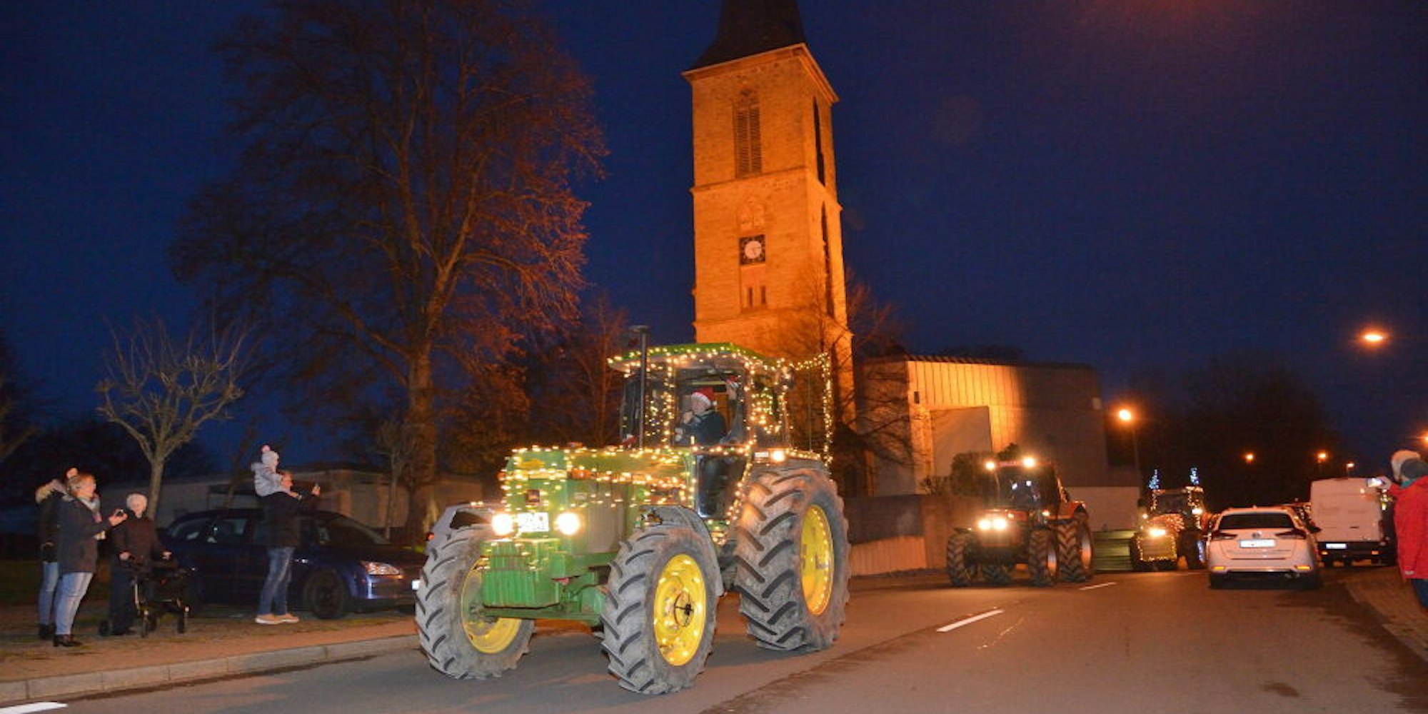 Rhein-Berg – Im Konvoi kommt gut ein Dutzend Trecker angerattert ins Gewerbegebiet Cliev am Rande von Kürten-Herweg. An Bord sind Landwirte vom konventionellen Milch- bis zum Biobauern aus dem Bergischen Land. Bei näherem Hinsehen entdeckt man in der untergehenden Sonne glimmende Lichterketten an den Reifen und auf der Fahrerkabine. Da sind Tannenbäume und die Bauern tragen alle rote Zipfelmützen.
