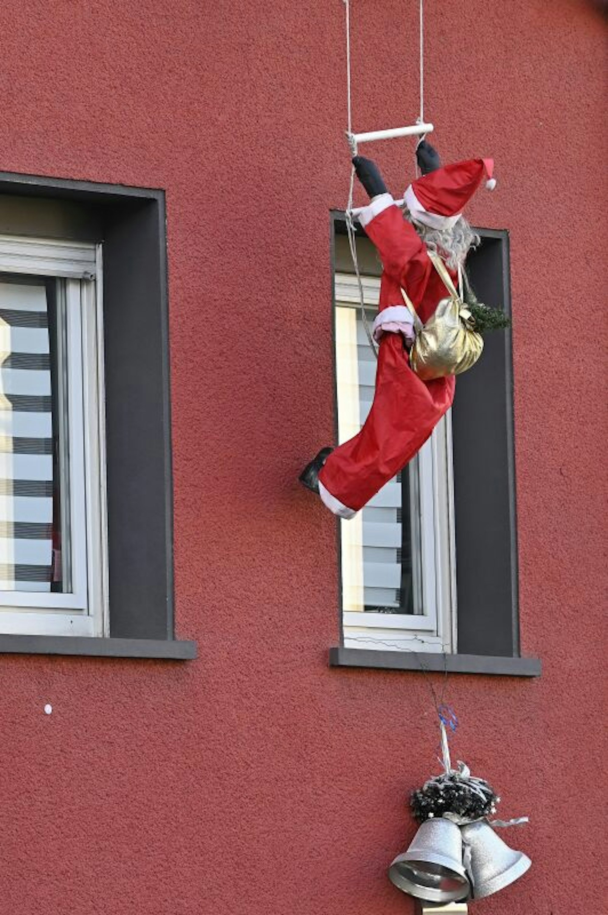 Andere sind ewige Fassadenkletterer. Schwungvoll geht es bei ihnen die ersten Meter auf der Strickleiter nach oben, später verharren die Nikoläuse und Weihnachtsmänner mit ihren Geschenke-Rucksäcken kurz vorm Ziel. Durchhalten ist jetzt wichtig. Offenbar gehen die Fenster oder Rollladen nicht auf, so ein Pech. Da hätten die freundlichen Geschenkebringer besser die Variante mit dem Schornstein genommen, mit zielsicherer Landung im Wohnzimmer.