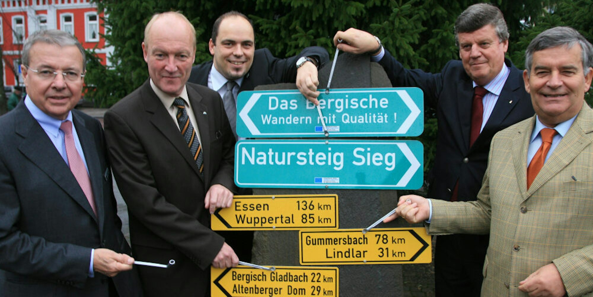 2009 übergibt Hans Peter Lindlar (2.v.r.) die Förderbescheide für Bergisches Wanderland und Natursteig Sieg in Overath an (v.l.) Landrat Frithjof Kühn (Rhein-Sieg), Landrat Rolf Menzel (Rhein-Berg), Mathias Derlin, Bürgermeister Andreas Heider, Landrat Hagen Jobi (Oberberg).