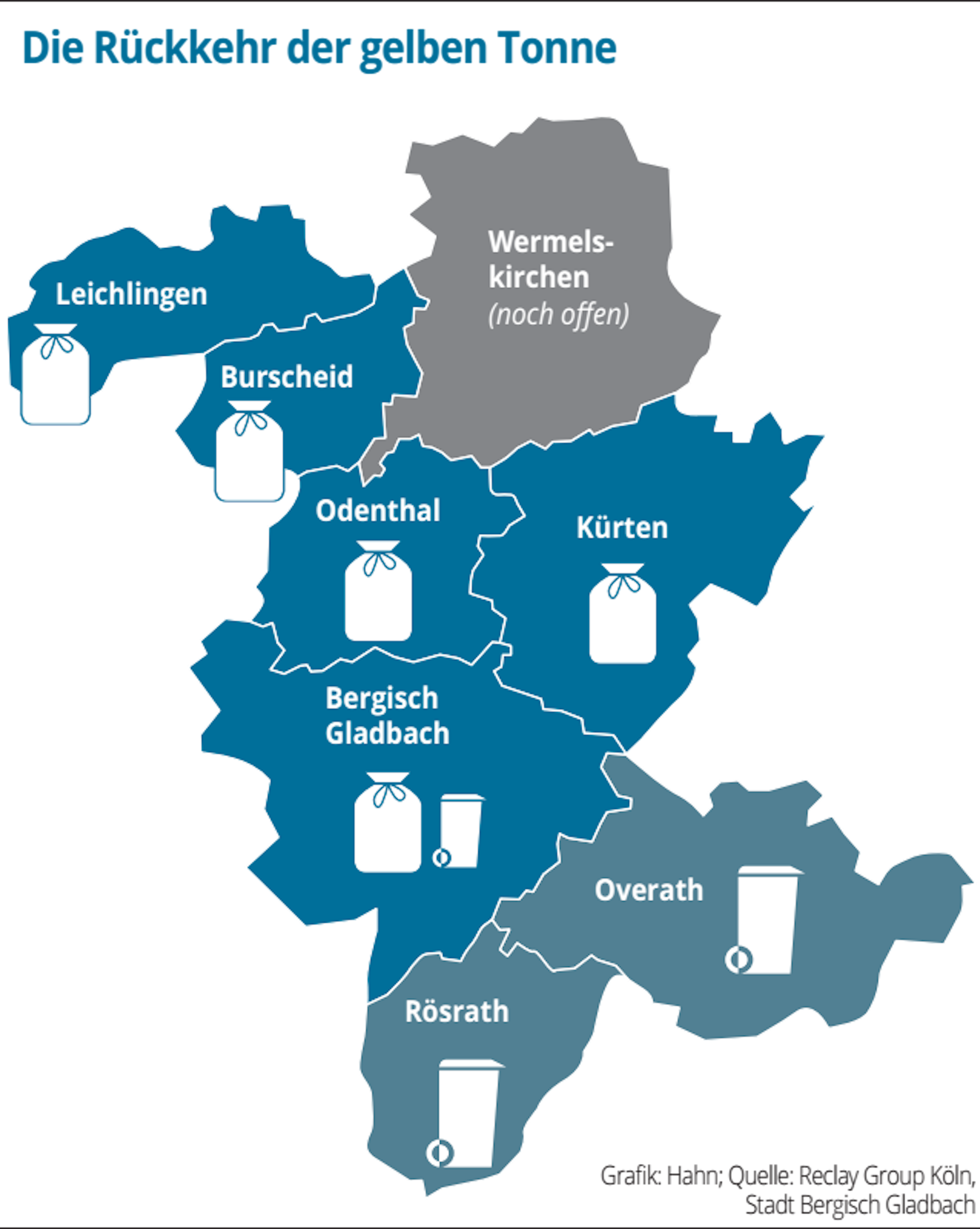In Kürten wird ab Januar 2020 komplett umgestellt auf gelbe Säcke. Die rund 1000 Gelben Tonnen, Altbestand wie in Gladbach, werden nicht mehr abgeholt. Grund ist die Weigerung des Dualen Systems, mehr als 1000 Tonnen abzuholen. Tatsächlich ergab eine Zählung, dass es 1600 Tonnen in der Gemeinde gibt.