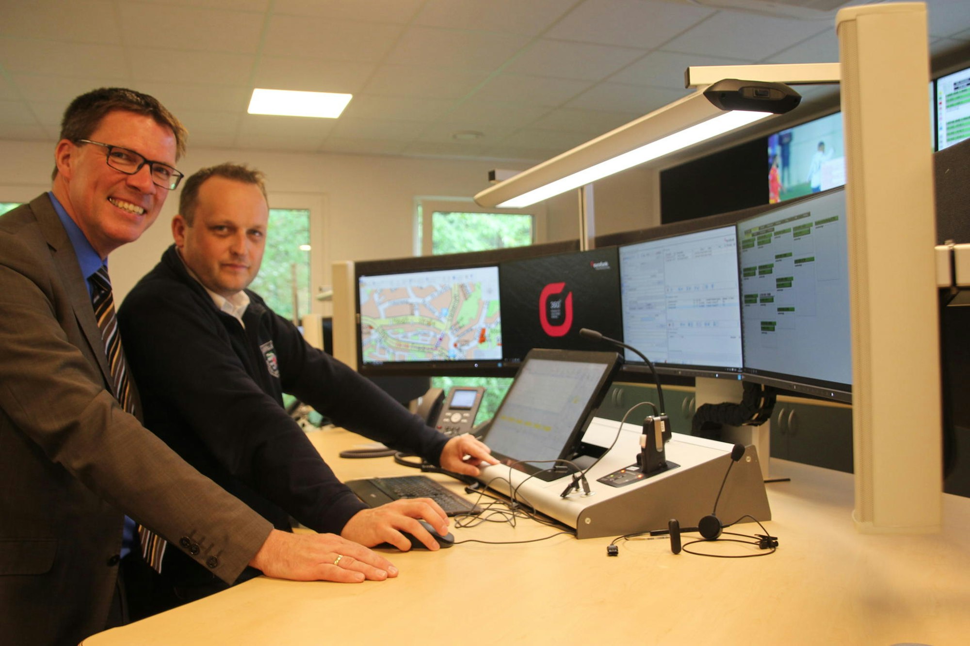 Landrat Stephan Santelmann (l.) und der stellvertretende Leitstellen-Chef Werner Eichholz in der „Interimsleitstelle“ des Kreises am Kreishaus Bergisch Gladbach.