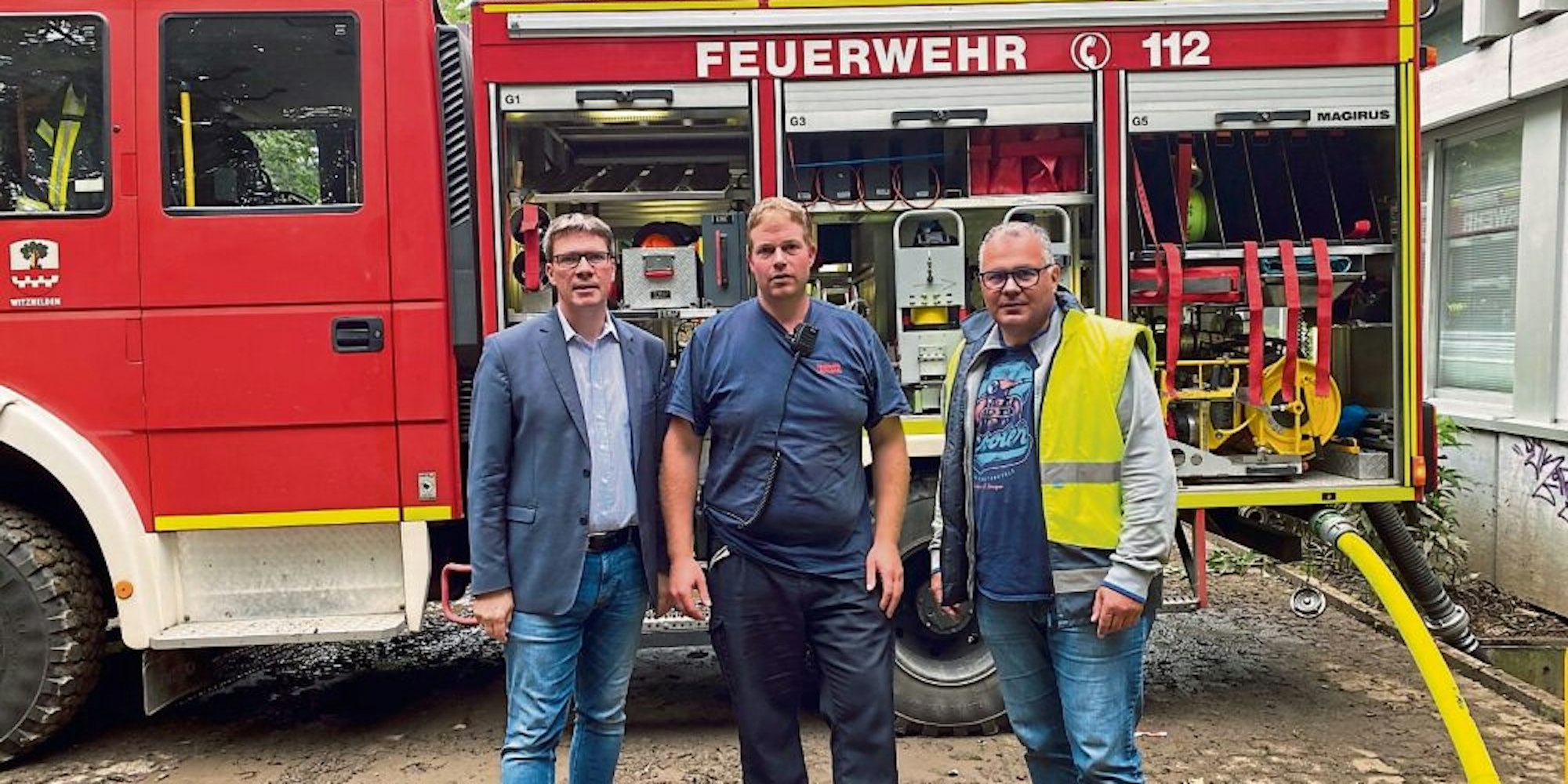 Landrat Santelmann (l.) am Freitag mit Bürgermeister Frank Steffes (r.) und Stadtbrandmeister Björn Heitmann in Leichlingen.