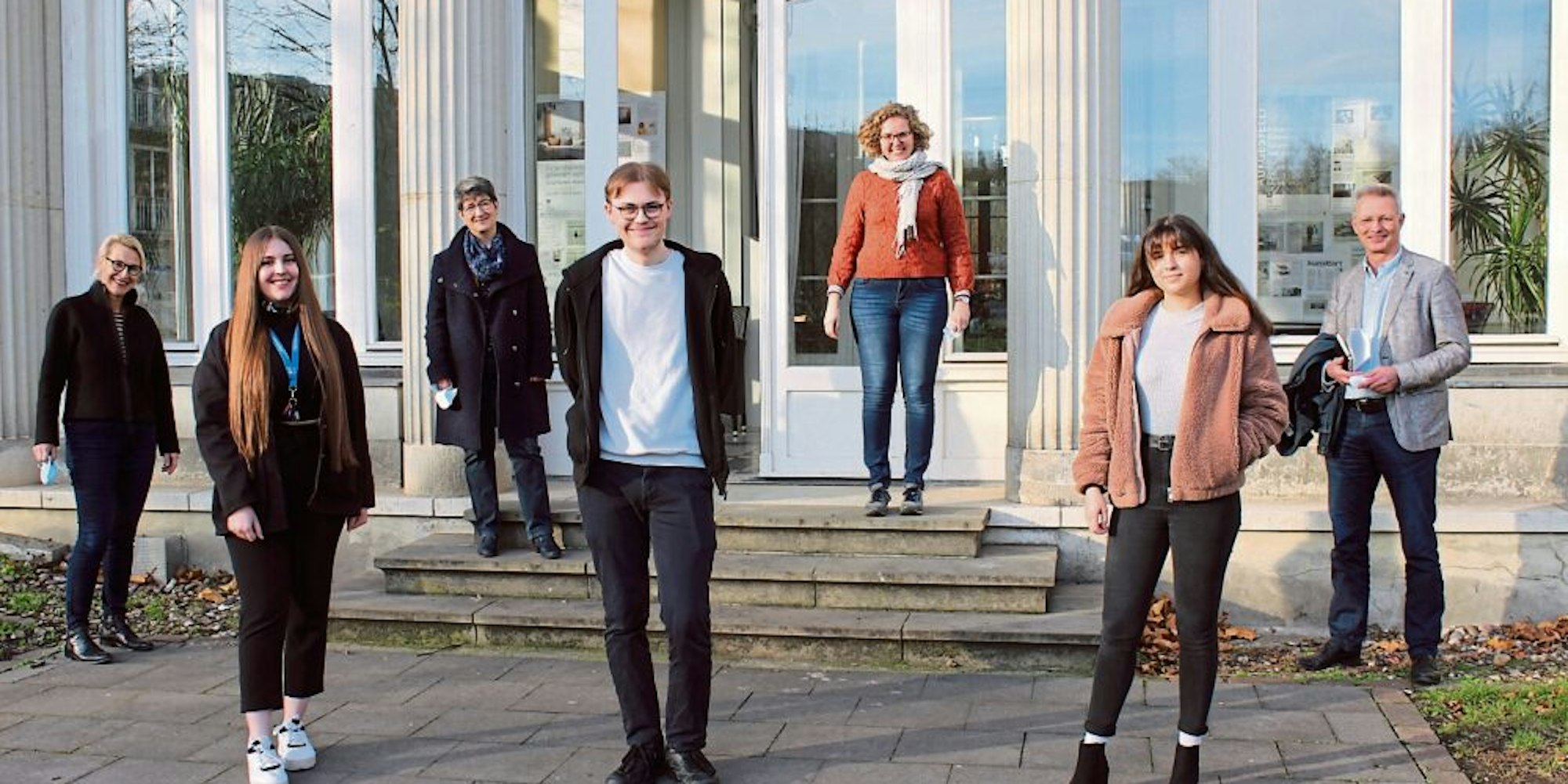 Neue FSJ-ler in der Kultur 2020/21: (v.l.) Egi Kodra, Severin Janssen und Carolin Alberti. Jeweils links hinter ihnen die betreuenden Kolleginnen Dr. Petra Oelschlägel, Anke Kuffner und Sandra Brauer. Rechts Fachbereichsleiter Dettlef Rockenberg.