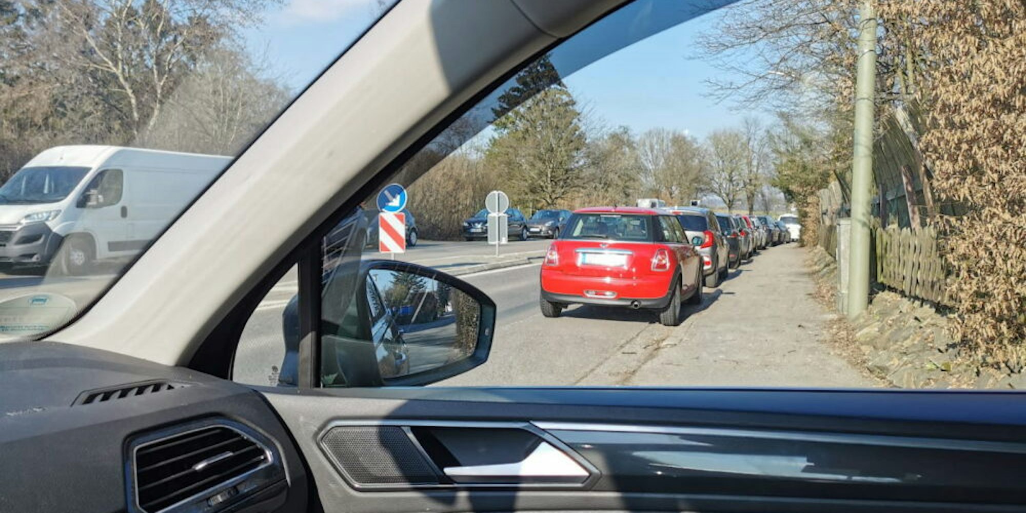 Die Seitenstreifen an der Straße neben dem Wanderparkplatz Hutsherweg in Kürten sind zugestellt.