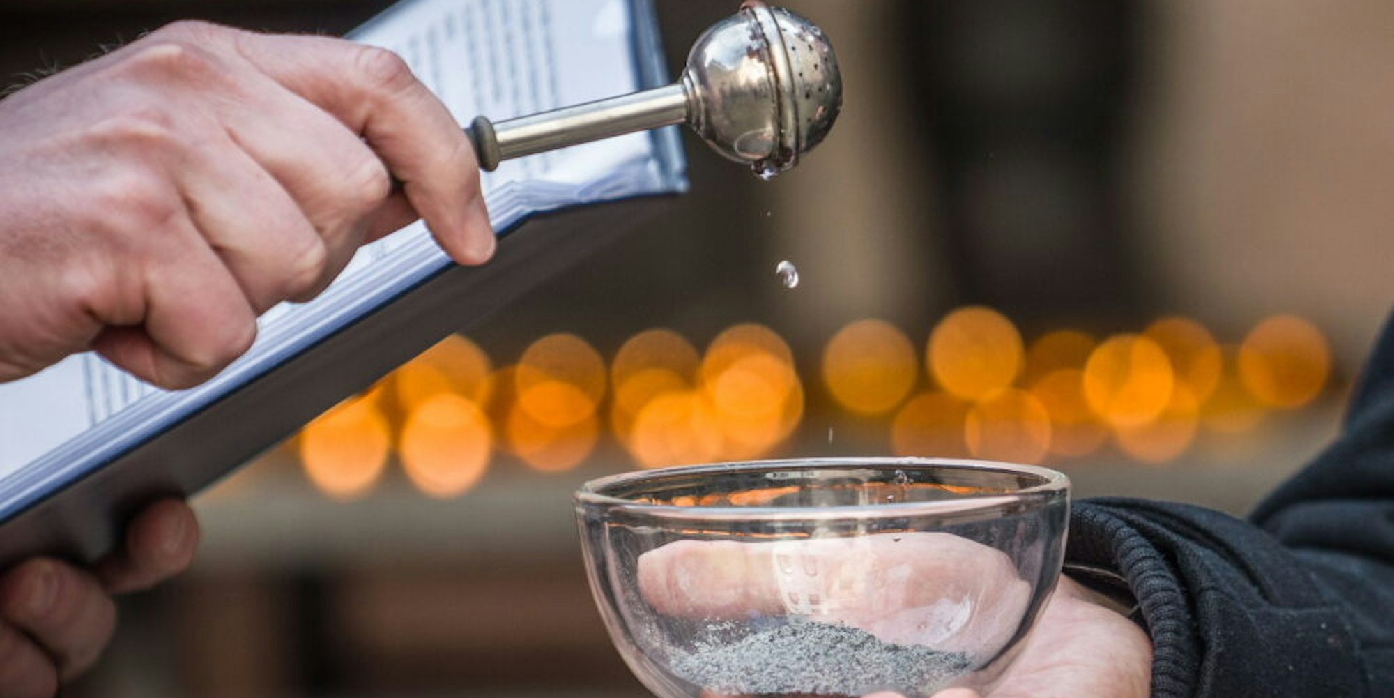 Vor dem Aschenkreuz oder – in diesem Jahr – dem Aschestreuen auf den Kopf wird die Asche mit Weihwasser gesegnet.