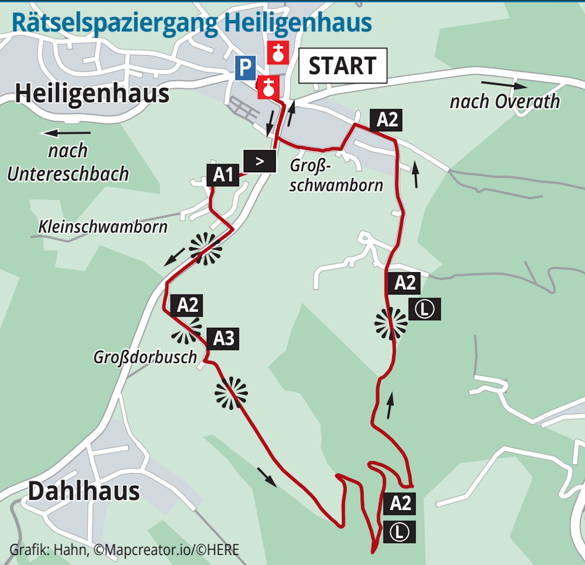 Wir folgen der Straße „Linder Weg“ immer geradeaus, bis sie auf die Alte Kölner Straße trifft, der wir nach links folgen, um nach 165 Metern links in die Straße Großschwamborn abzubiegen. Wir folgen der Straße durch eine Rechtskurve, erreichen einen Bauernhof und notieren vom blau-weißen Schild am zurückliegenden Holzhäuschen den dritten Buchstaben als zehnten unseres Lösungsworts. Weiter geht’s, an einer Krippe in einer Einfahrt vorbei zur Durbuscher Straße, dort rechts und am Kreisel links zum Ausgangspunkt.