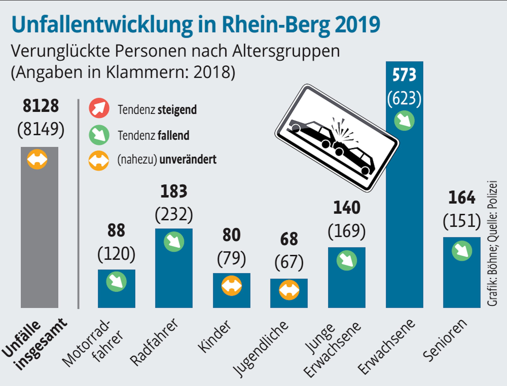 Auf die Altersgruppen geblickt, hat die Zahl der verunglückten Kinder, Jugendlichen und Senioren im vergangenen Jahr leicht zugenommen. Jüngere und ältere Menschen gelten als besonders gefährdet im Straßenverkehr, oft sind sie als Fußgänger oder Radfahrer relativ schutzlos unterwegs. 80 Kinder verunglückten 2019 im Straßenverkehr, zwei mehr als 2018. 68 Jugendliche waren an Unfällen beteiligt, im Vorjahr 67. 164 Senioren kamen 2019 auf den bergischen Straßen zu Schaden, 2018 waren es 151, im Jahr 2017 139. Die Zahlen für 2019 sind der dritte Anstieg in Folge und der höchste Wert der vergangenen sechs Jahre. Sie liegen aber weiterhin unter dem NRW-Landesmittel.