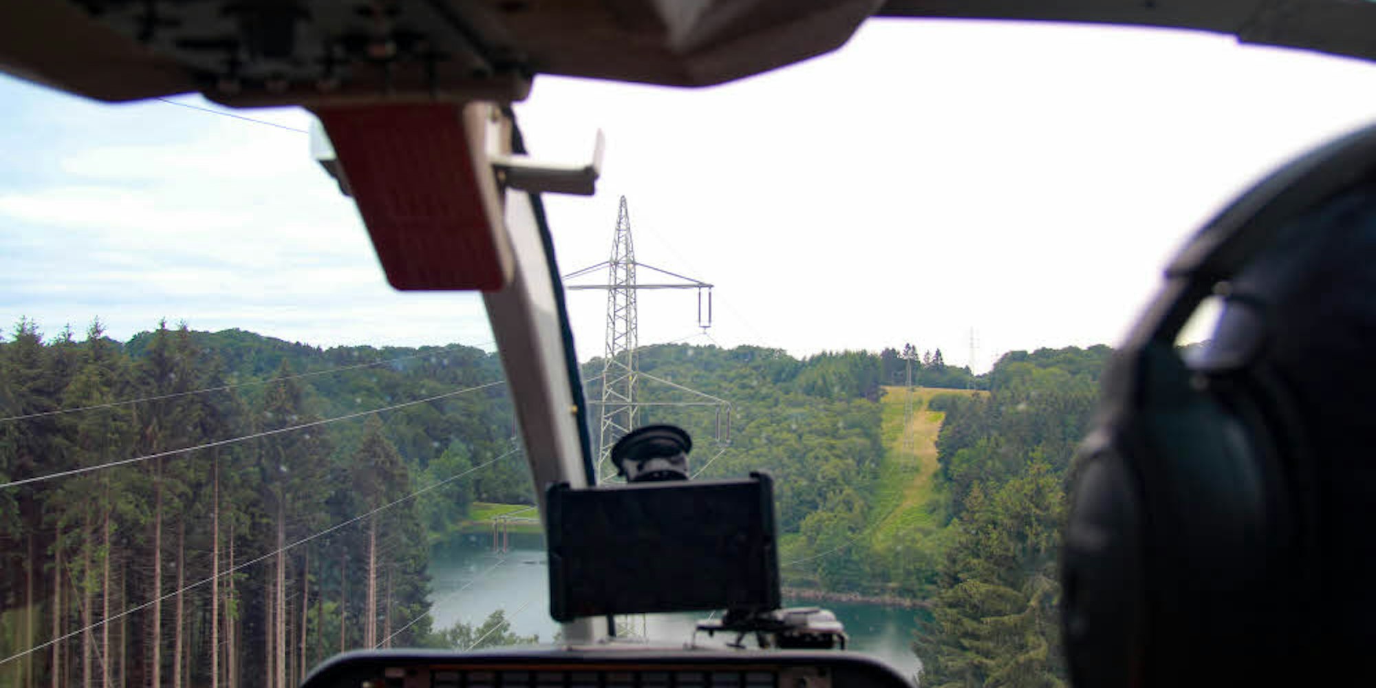 Mit knapp 20 Kilometer pro Stunde fliegt der Helikopter entlang einer Waldschneise von Mast zu Mast, passiert jeden mit Schrittgeschwindigkeit und nachdem mögliche Beschädigungen protokolliert sind, geht es weiter nach Bergisch Gladbach.