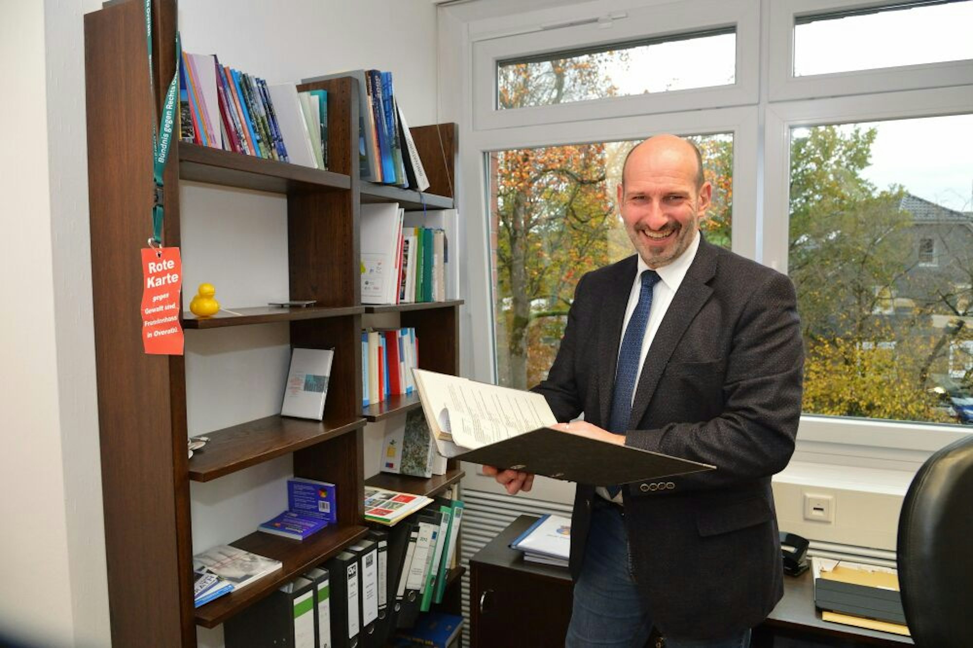 Gleich am frühen Morgen wurde der neue Overather Bürgermeister, Christoph Nicodemus, „arbeitsfähig gemacht“: Die IT-Abteilung im Rathaus richtete ihm seinen Rechner ein, es fehlte nur noch die passende Maus, die im Laufe des Vormittags nachgeliefert werden sollte. Das Foto seiner Frau hatte Nicodemus bereits auf den Schreibtisch gestellt, die Schreibtischschubladen schon am Sonntagabend eingeräumt – alles bereit für den ersten Tag im neuen Amt. An den Wänden hängen ein Lieblingsbild und ein Street Art Kalender.