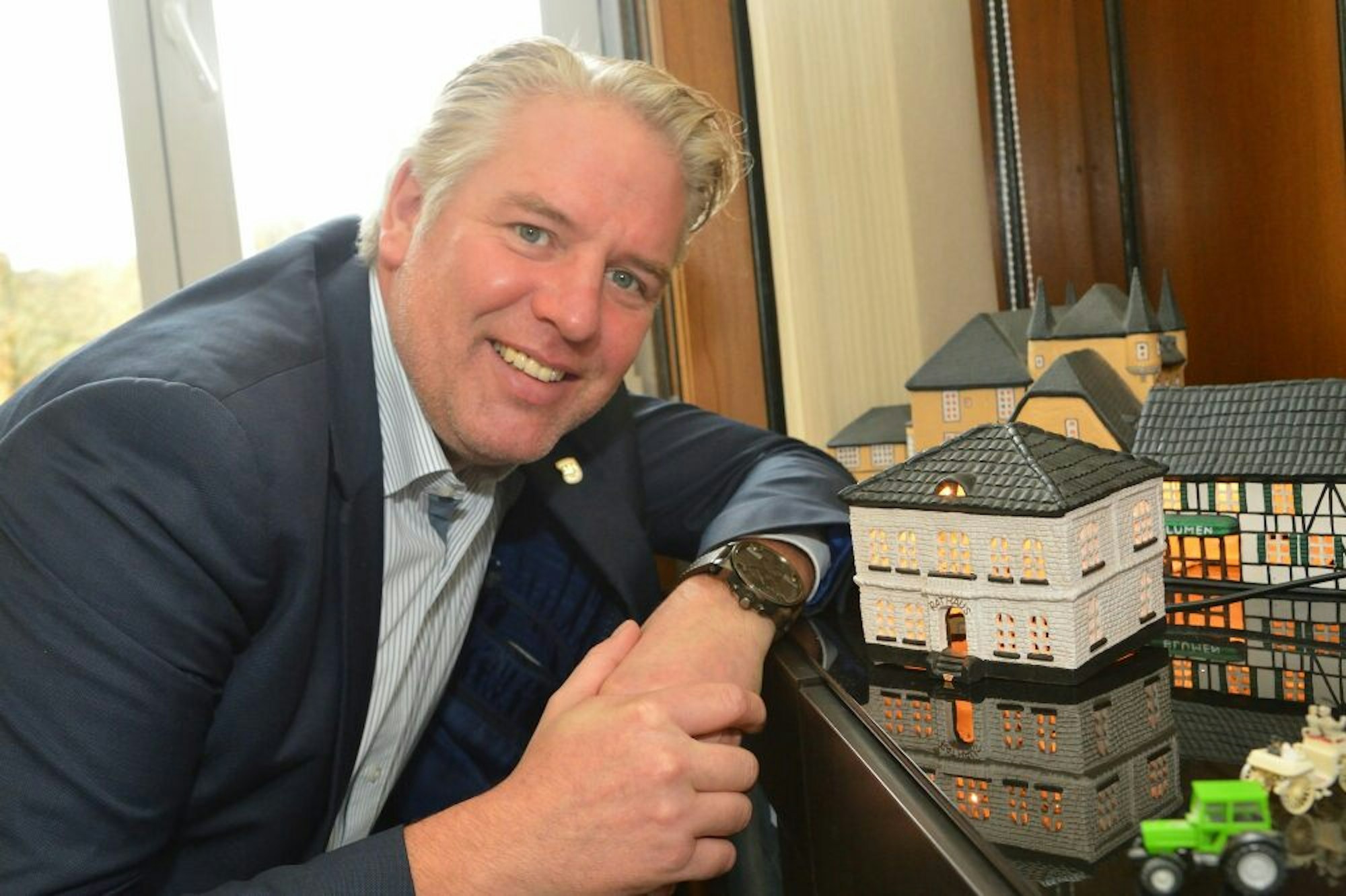 Lennerts’ Arbeitstag beginnt immer schon früh morgens daheim mit dem Beantworten und Weiterleiten von E-Mails. In seinem Büro haben die Keramik-Minitiaturen mit Motiven der Gemeinde immer einen Ehrenplatz. (cbt)