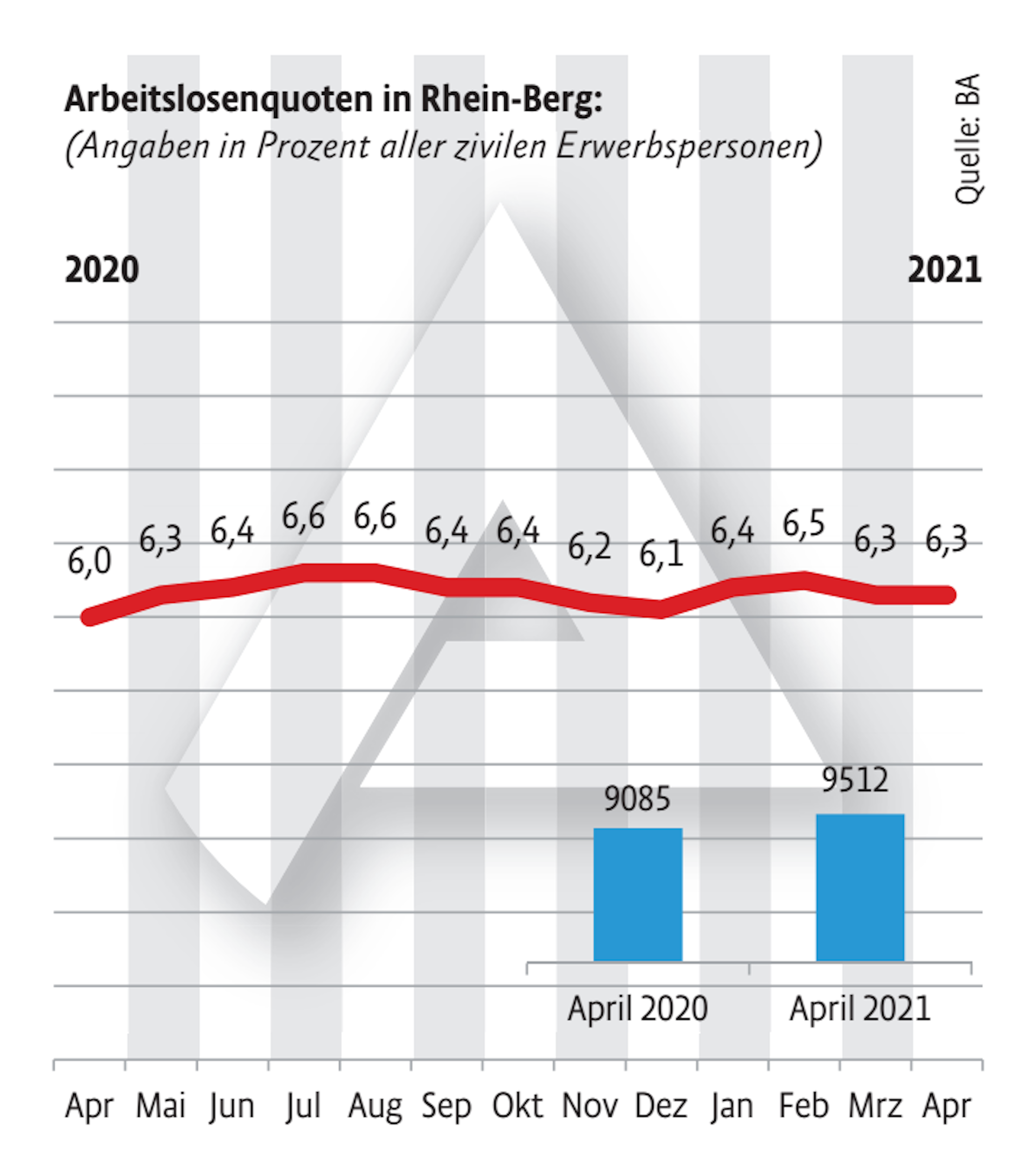 545 Menschen haben ihre Stelle verloren und sich arbeitslos gemeldet. Das sind 72 Personen mehr als im März. Gleichzeitig haben 568 Arbeitsuchende wieder eine Beschäftigung auf dem ersten Arbeitsmarkt gefunden. Das sind laut Statistik der Agentur 45 Menschen mehr als im März und 241 Menschen mehr als im gleichen Zeitraum des Jahres 2020. Die Arbeitslosenquote liegt in Rhein-Berg nun bei 6,3 Prozent.