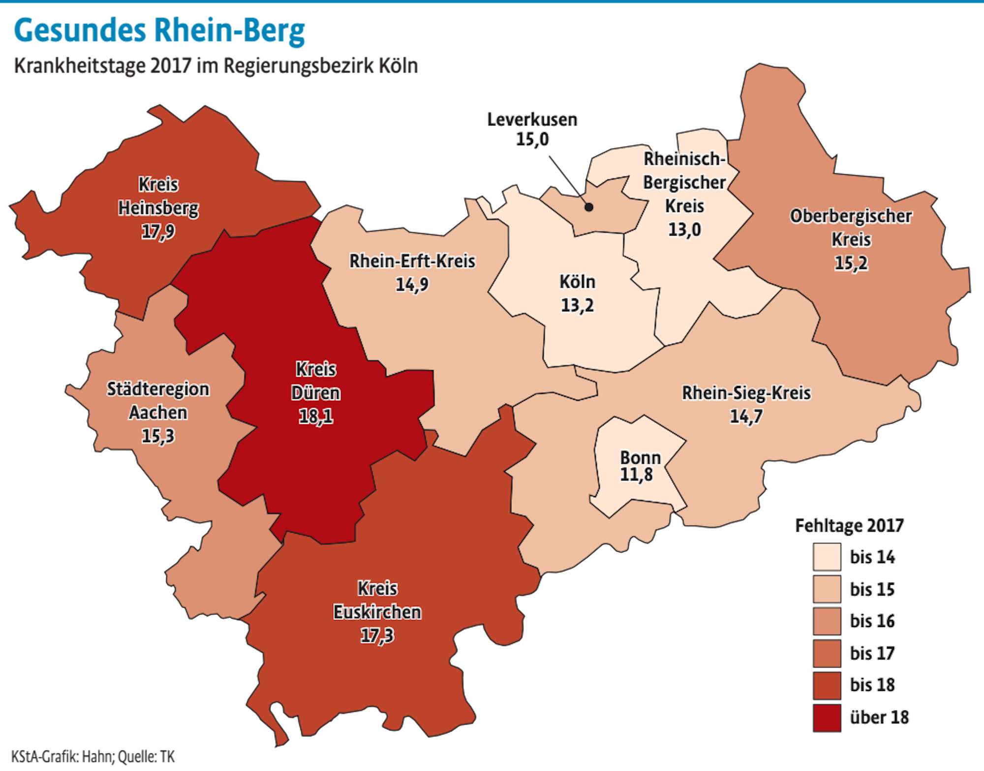 Hauptursachen für die Krankmeldungen waren psychische Probleme, Rückenschmerzen sowie akute Infekte der oberen Atemwege. NRW-weit liegt Rhein-Berg auf Platz 3 hinter den Großstädten Bonn und Düsseldorf (12,4). Das schlechteste NRW-Ergebnis erzielte Gelsenkirchen mit 21,2 Tagen.