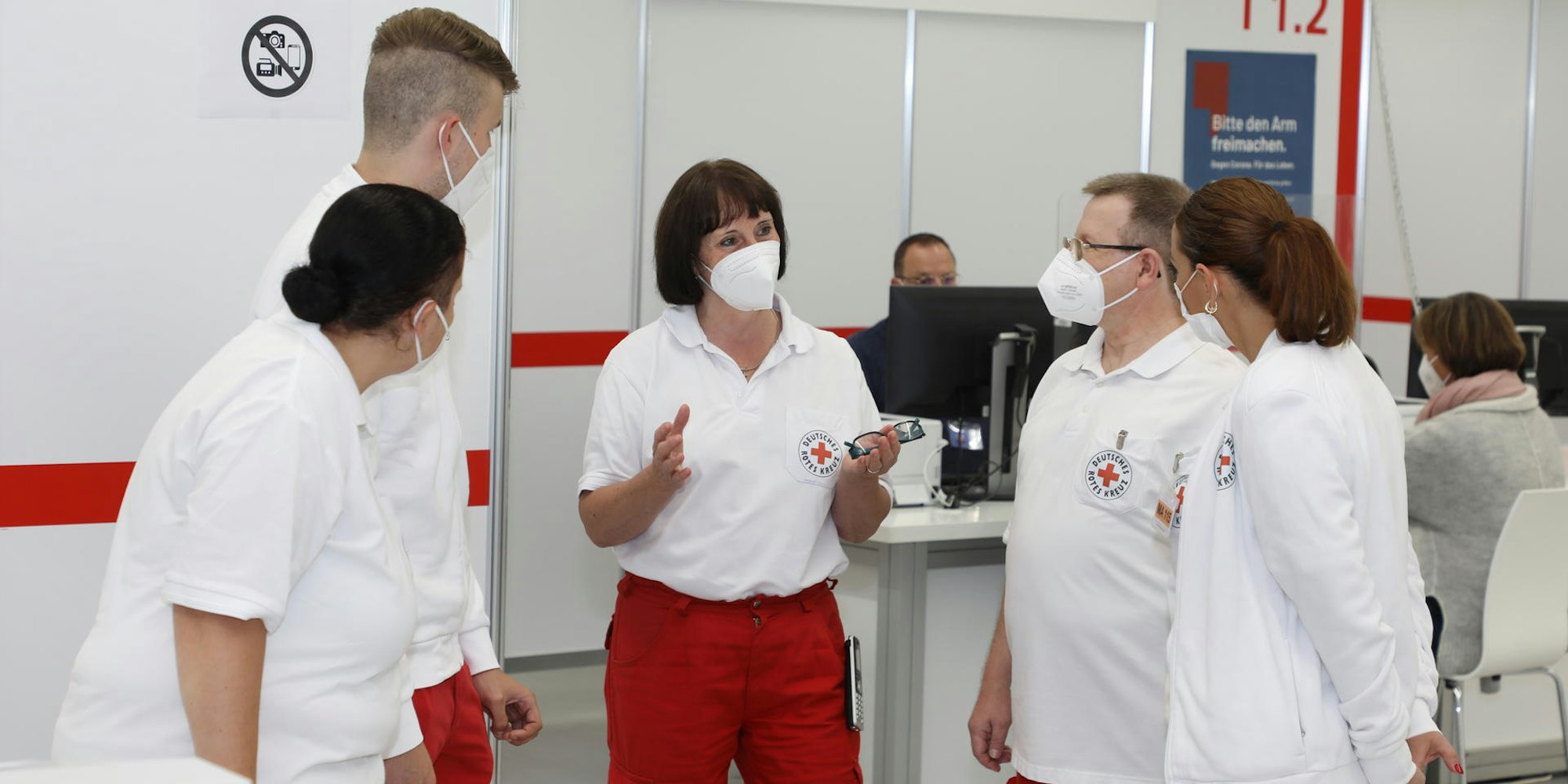 Ein starkes Team: DRK-Kreisvorsitzende Ingeborg Schmidt (M.) mit DRK-Mitarbeitenden am Empfang des Gladbacher Impfzentrums.