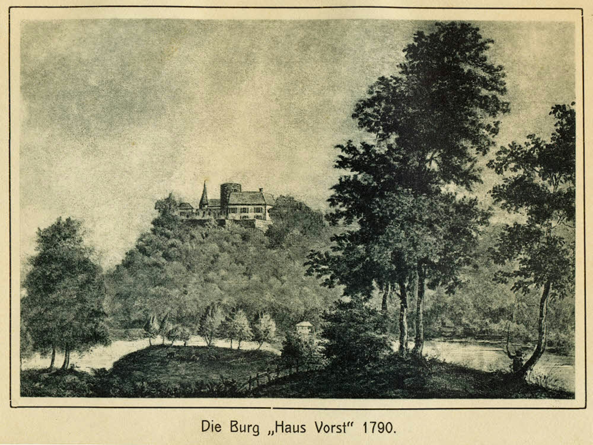Die älteste bekannte Ansicht der Burg im Jahre 1790, eine Zeichnung, die Carl vom Berg 1909 veröffentlicht hat.