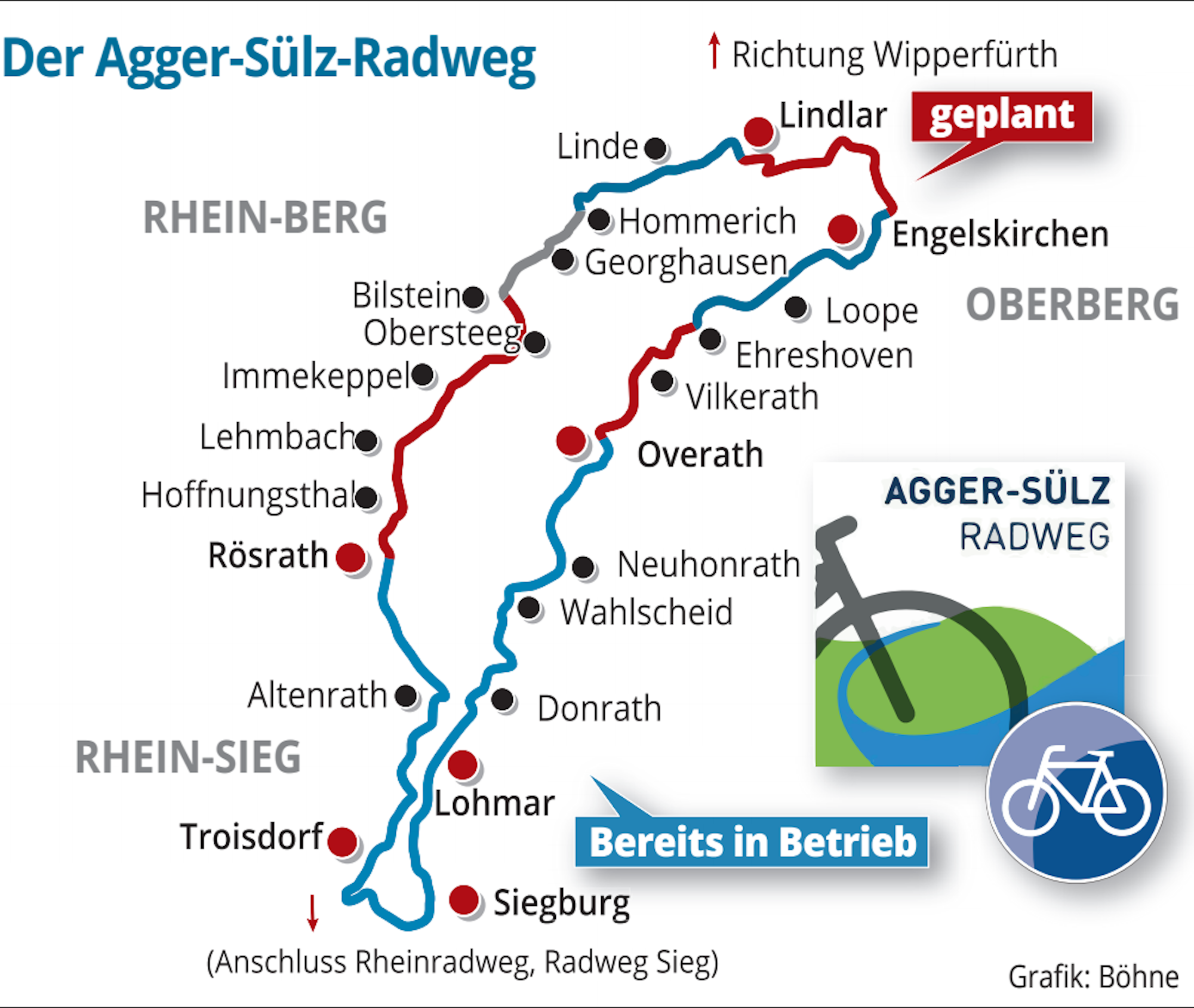 Der „Naturnahe Sülztalweg“ ist Teil des anvisierten kreisübergreifenden Agger-Sülz-Radwegs, den der Rheinisch-Bergische Kreis zusammen mit den benachbarten Kreisen vorantreibt. Bisher sind bereits einige Teilstücke realisiert. Gemeinsam haben die Kreise den Agger-Sülz-Radweg als Projekt zur Regionale 2025 eingereicht, dieses hat inzwischen den vielversprechenden Status B erhalten (wir berichteten).